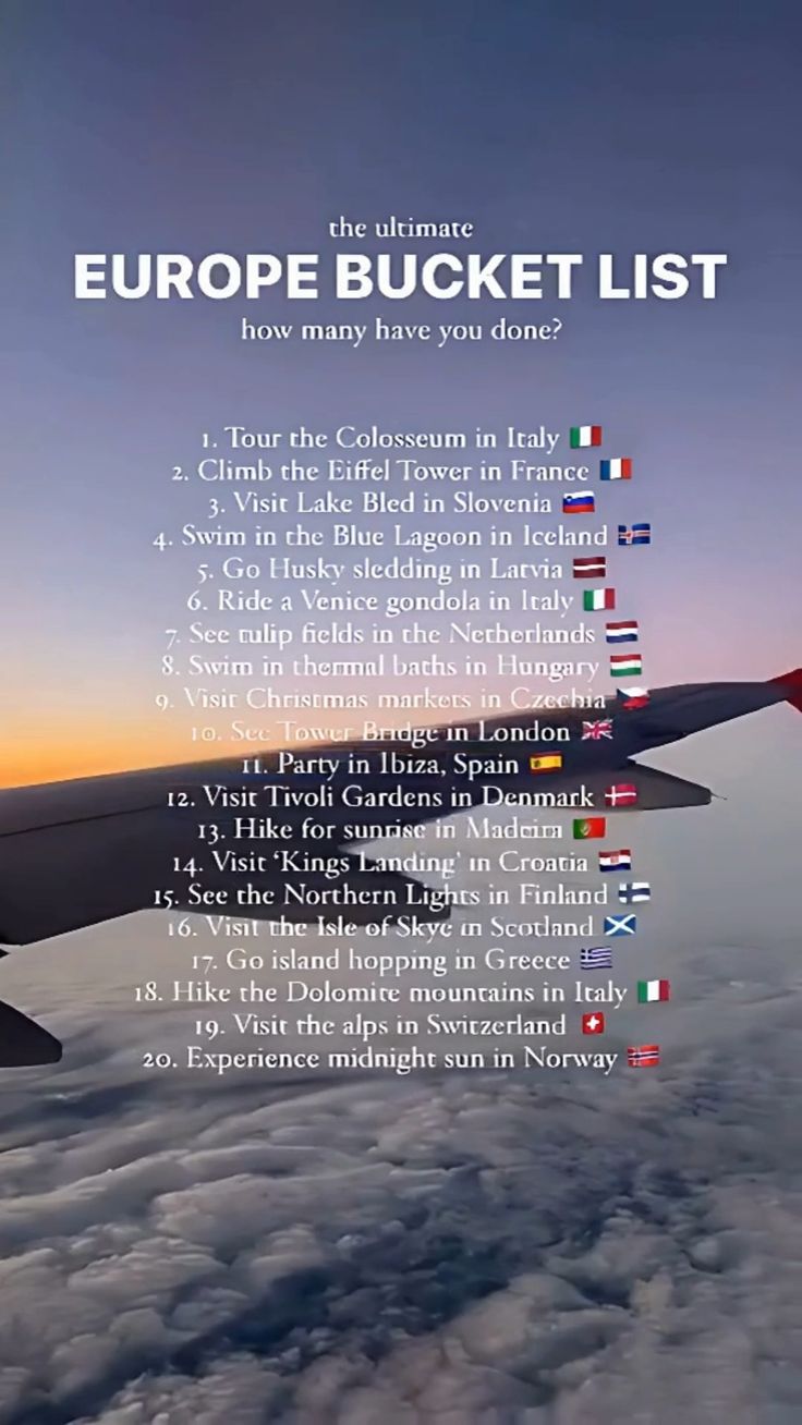 Apr 16, 2025 – Our ultimate Europe travel bucket list. How many have you done? ✈️ Show it to someone who you want to travel with 😉 #travel #travellife #traveltips #vacation #vacationvibes #getaway #travelblog #travelinspiration #travelling #travelguide #vacationdestination #coupletravel #romanticgetaway #familytrip #travelwithkids