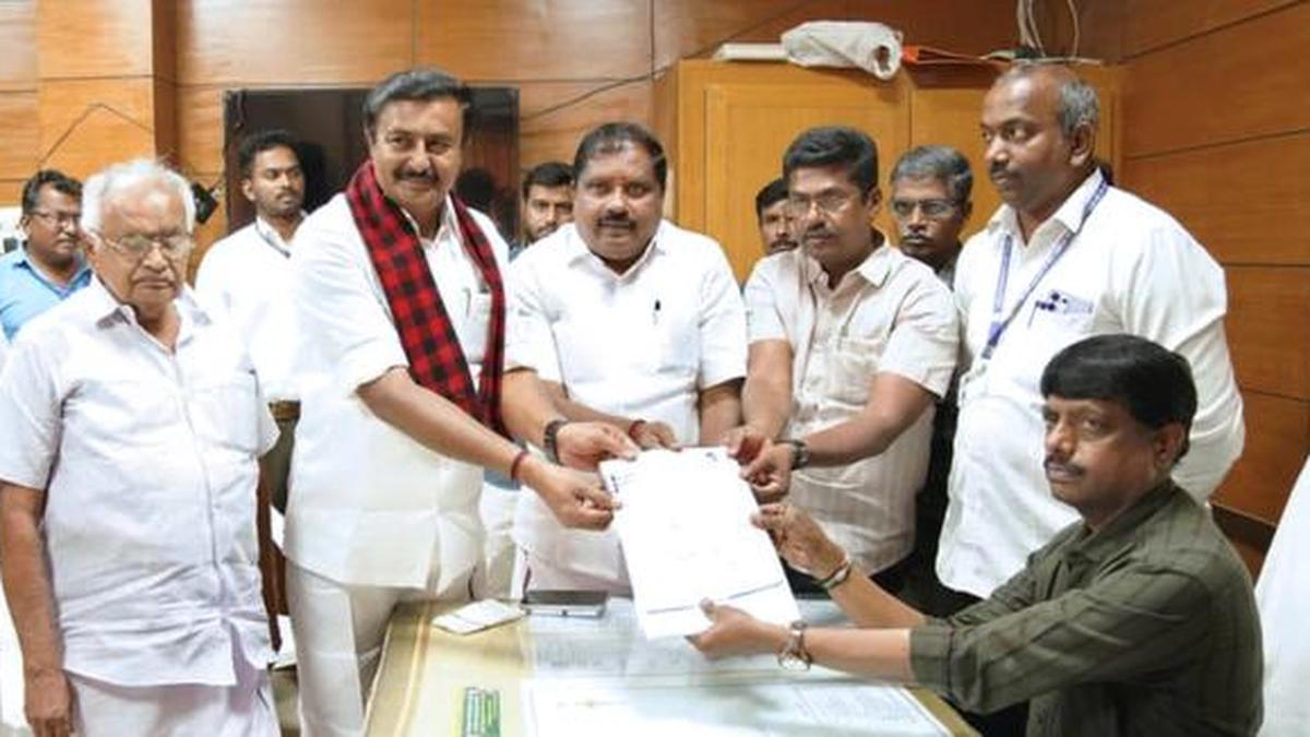 DMK’s M.P. Saminathan filing nomination for Kangayam constituency in Tiruppur district on Monday.