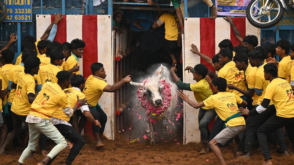 A jallikattu bull springs out of the ‘vadivasal’ during the bull-taming sport held at Thatchankurichi village in Pudukottai district on Saturday.
