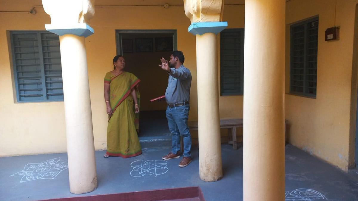 An official of Roads and Buildings discussing with Gurajada Appa Rao family member Gurajada Indira with regard to repairs of poets house located near Vizianagaram Fort.