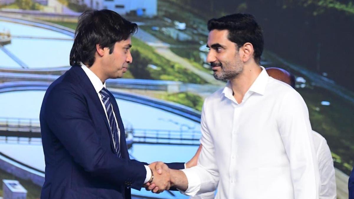 IT and HRD Minister Nara Lokesh greeting ArcelorMittal CEO Aditya Mittal during the groundbreaking ceremony of the AMNS India greenfield steel plant at Nakkapalli on Monday.