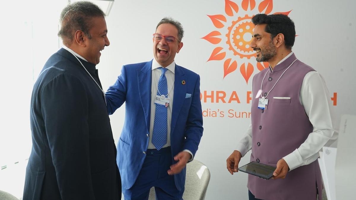 Andhra Pradesh IT & HRD Minister Nara Lokesh during a discussion with RMZ Group Chairman Manoj Menda at the World Economic Forum meeting in Davos.