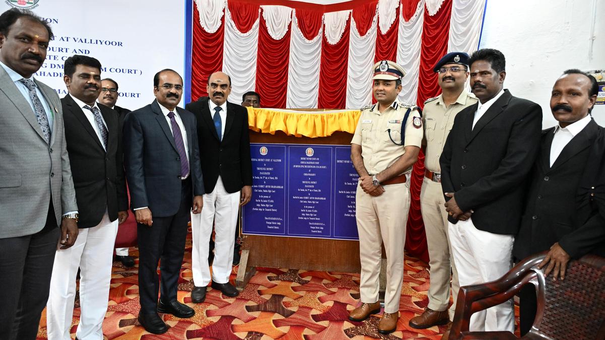 Principal district judge M. Saisaravanan and Tirunelveli District Collector R. Sukumar participating in the new court buildings inaugural function in Tirunelveli district court complex on Tuesday. | Photo Credit: A. SHAIKMOHIDEEN Chief Justice of Madras High Court Sushrut Arvind Dharmadhikari virtually inaugurated the Additional District Court in Valliyoor, the District Munsif-cum-Judicial Magistrate Court in Thisaiyanvilai and District Munsif Court and Judicial Magistrate Court in Cheranmahadevi on Tuesday. Justice P.T. Asha of Madras High Court was present. District Collector R. Sukumar, Principal District Judge M. Saisaravanan, Tirunelveli Commissioner of Police Deshmukh Shekhar Sanjay, Superintendent of Police V. Prassannakumar, Chief Judicial Magistrate T. Rajakumar and members of Tirunelveli Bar Association were present. Published – March 17, 2026 07:36 pm IST Share this: Click to share on WhatsApp (Opens in new window) WhatsApp Click to share on Facebook (Opens in new window) Facebook Click to share on Threads (Opens in new window) Threads Click to share on X (Opens in new window) X Click to share on Telegram (Opens in new window) Telegram Click to share on LinkedIn (Opens in new window) LinkedIn Click to share on Pinterest (Opens in new window) Pinterest Click to email a link to a friend (Opens in new window) Email More Click to print (Opens in new window) Print Click to share on Reddit (Opens in new window) Reddit Click to share on Tumblr (Opens in new window) Tumblr Click to share on Pocket (Opens in new window) Pocket Click to share on Mastodon (Opens in new window) Mastodon Click to share on Nextdoor (Opens in new window) Nextdoor Click to share on Bluesky (Opens in new window) Bluesky Like this:Like Loading... Post navigation Jagan sees ‘widespread public discontent’ against NDA government in Andhra Pradesh Vyasa wins the Onnu Onnu Plate (Div. I)