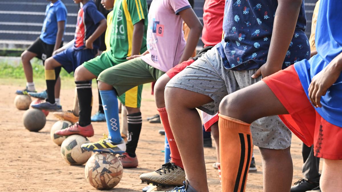 Children learning the basics of football at the ongoing summer sports camp in Visakhapatnam. FILE PHOTO