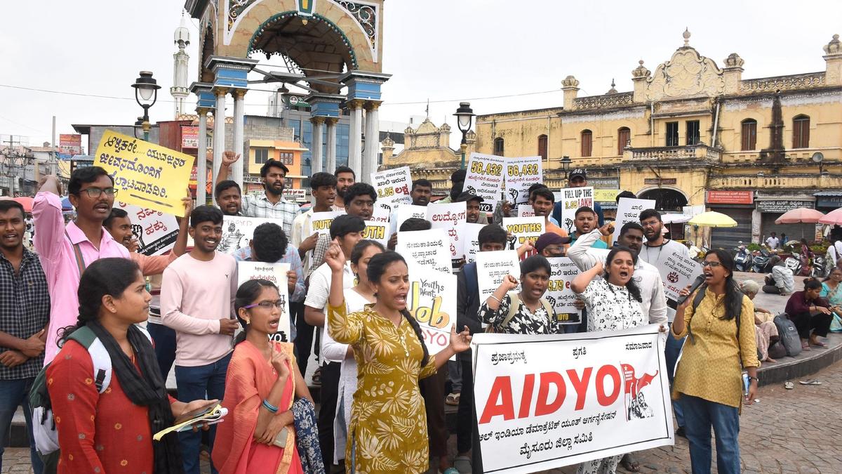 Members of AIDYO staging a demonstration in Mysuru on Friday. | Photo Credit: M. A. Sriram The All India Democratic Youth Organisation (AIDYO), Mysuru district committee, on Friday urged Chief Minister Siddaramaiah to issue a government notification for the appointment of 56,432 vacant posts in various departments at the earliest. Referring to the State government’s announcement regarding the recruitment of over 56,000 vacant posts across departments, the organisation demanded that the notification be issued without further delay. Members of AIDYO staged a demonstration in the city, pressing for the immediate filling up of all vacant posts in government departments. They also called upon the government to take steps to fill up vacant posts totalling 2,84,881 in 43 departments across the State. Seeking a transparent recruitment process, they demanded that entrance examinations be conducted free from irregularities. They further insisted that the application process should not involve high fees and that job aspirants must be provided free transportation to attend recruitment examinations. The organisation also demanded that jobless youth be provided with unemployment allowance until they secure jobs, enabling them to lead a dignified life. To address discrepancies and irregularities allegedly reported in the Karnataka Public Service Commission (KPSC), AIDYO urged the government to implement the recommendations of the Hota Committee. Additionally, the organisation appealed to the government to drop the KPA Magnet School plan and refrain from shutting down any government schools, stating that such institutions are vital for children from economically weaker sections. Published – February 27, 2026 07:15 pm IST Share this: Click to share on WhatsApp (Opens in new window) WhatsApp Click to share on Facebook (Opens in new window) Facebook Click to share on Threads (Opens in new window) Threads Click to share on X (Opens in new window) X Click to share on Telegram (Opens in new window) Telegram Click to share on LinkedIn (Opens in new window) LinkedIn Click to share on Pinterest (Opens in new window) Pinterest Click to email a link to a friend (Opens in new window) Email More Click to print (Opens in new window) Print Click to share on Reddit (Opens in new window) Reddit Click to share on Tumblr (Opens in new window) Tumblr Click to share on Pocket (Opens in new window) Pocket Click to share on Mastodon (Opens in new window) Mastodon Click to share on Nextdoor (Opens in new window) Nextdoor Click to share on Bluesky (Opens in new window) Bluesky Like this:Like Loading... Post navigation T20 World Cup | Most important thing is that we’ve been winning, says Rabada Food safety squads intensify crackdown on unhygienic snack production