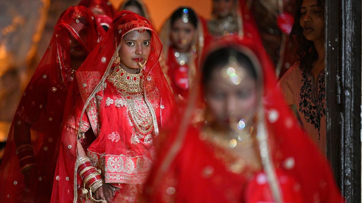 Brides and grooms take part in a mass wedding organised by Ladli Foundation in partnership with Avdheshanand G Mission at The Zora Convention Centre in New Delhi on March 30, 2026.