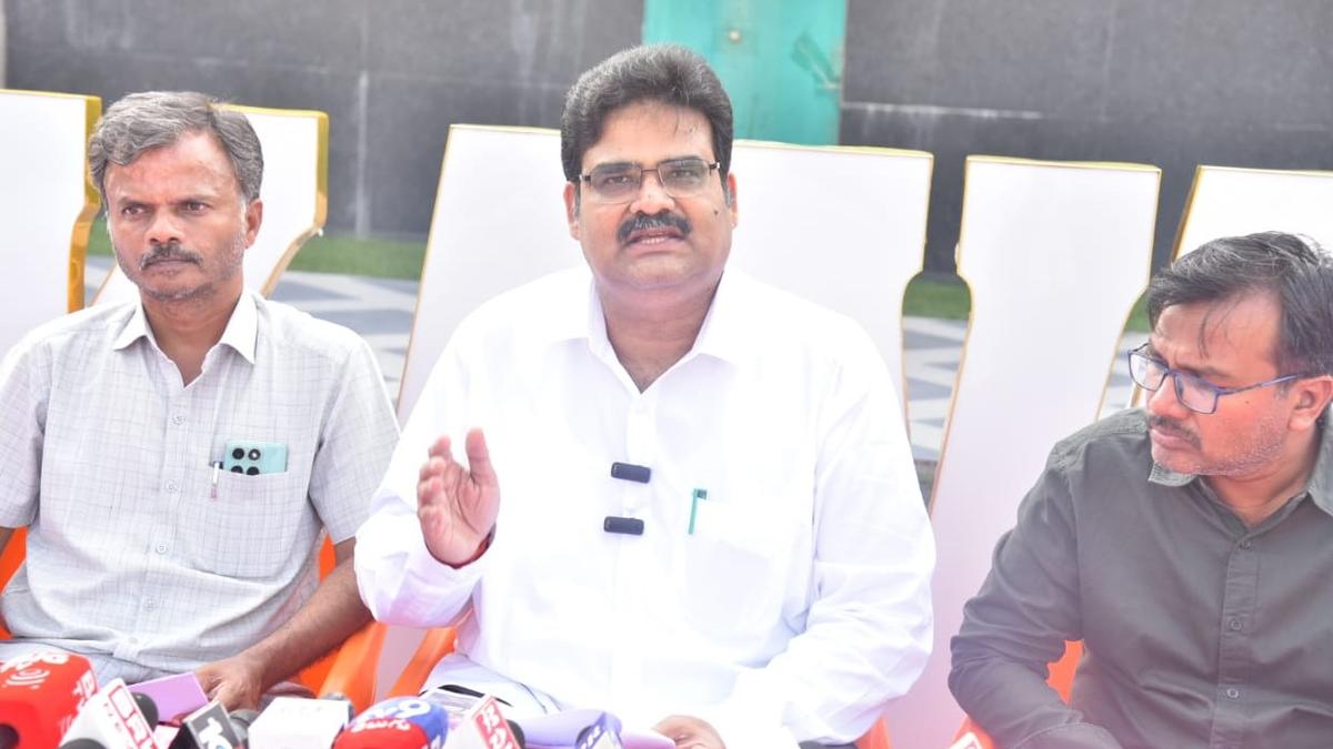Lanka Dinakar (centre), Chairman of the 20-Point Programme Implementation Committee,  addressing the media at Kavali in Nellore district on March 21, 2026.