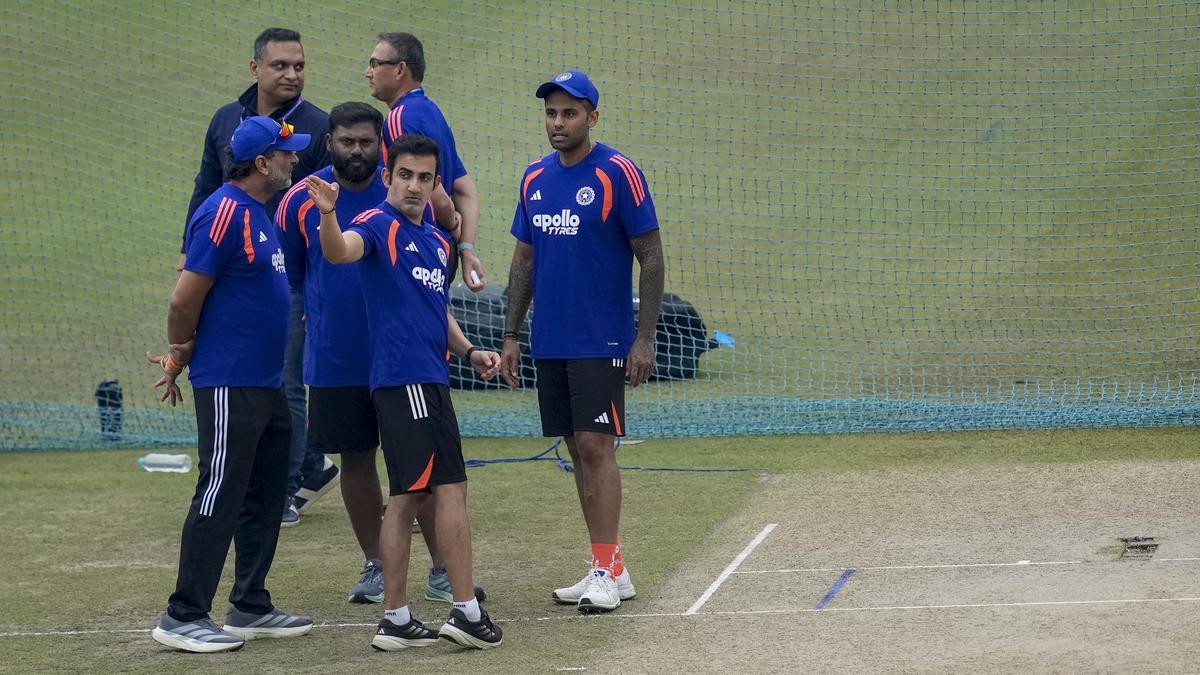 India's captain Suryakumar Yadav, head coach Gautam Gambhir, batting coach Sitanshu Kotak, BCCI selection committee Chairman Ajit Agarkar, and others inspect the pitch during a practice session ahead of an ICC Men's T20 World Cup 2026 cricket match between India and Pakistan, at R. Premadasa Stadium, in Colombo, Sri Lanka, on February 14, 2026.
