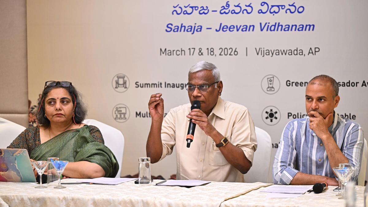 (From left) CMS Vatavaran Director General Vasanti Rao, C Raghavahchari Media Academy of Andhra Pradesh chairman Alapati Suresh Kumar, The Habitats Trust Director Rushkesh Chavan during a press meet on the Andhra LiFE for Nature Summit, in Vijayawada on Monday. | Photo Credit: K.V.S. GIRI The Andhra LiFE for Nature Summit 2026, a platform on sustainability and climate resilience, will be held on March 17 and 18 at Hyatt Place in Vijayawada, bringing together policymakers, scientists, media leaders and community practitioners. Addressing a press conference here on Monday (March 16, 2026), CMS Vatavaran Director General Vasanti Rao said that the first day will include a policy roundtable on integrating ecology into governance and development planning. On the second day, a multi-stakeholder dialogue will focus on partnerships among communities, institutions, civil society and media to advance environmental action in the State. During the summit finale, the Andhra Pradesh Green Ambassador Awards will be presented to environmentalist Komera Anka Rao for his conservation work in the Nallamala region and Soundarya Manohari Velamati for her contributions to rural development, water restoration, and women-led community initiatives. The summit will conclude with a session titled “Sahaja Samvad: Advancing Regenerative Development in Andhra Pradesh”. It would highlighting key outcomes and collaborative actions aimed at building a greener and climate-resilient future for the State, she said. C Raghavachari Media Academy of Andhra Pradesh chairman Alapati Suresh Kumar said that the environment and life issues have been as old as civilisations. “The environment was nothing but our life; if not protected it would lead to destruction. Policy makers, pressure groups such as media have to ponder over the environmental issues and concerns while making and implementing the policies and developmental programmes,” he said. The Habitats Trust Director Rushikesh Chavan also addressed the media. Published – March 16, 2026 08:13 pm IST Share this: Click to share on WhatsApp (Opens in new window) WhatsApp Click to share on Facebook (Opens in new window) Facebook Click to share on Threads (Opens in new window) Threads Click to share on X (Opens in new window) X Click to share on Telegram (Opens in new window) Telegram Click to share on LinkedIn (Opens in new window) LinkedIn Click to share on Pinterest (Opens in new window) Pinterest Click to email a link to a friend (Opens in new window) Email More Click to print (Opens in new window) Print Click to share on Reddit (Opens in new window) Reddit Click to share on Tumblr (Opens in new window) Tumblr Click to share on Pocket (Opens in new window) Pocket Click to share on Mastodon (Opens in new window) Mastodon Click to share on Nextdoor (Opens in new window) Nextdoor Click to share on Bluesky (Opens in new window) Bluesky Like this:Like Loading... Post navigation Opposition questions govt.’s plan to introduce Bill to codify deputation of IPS officers in Central Armed Police Forces Andhra Pradesh set to become first State to get Pramaan certification for forest produce