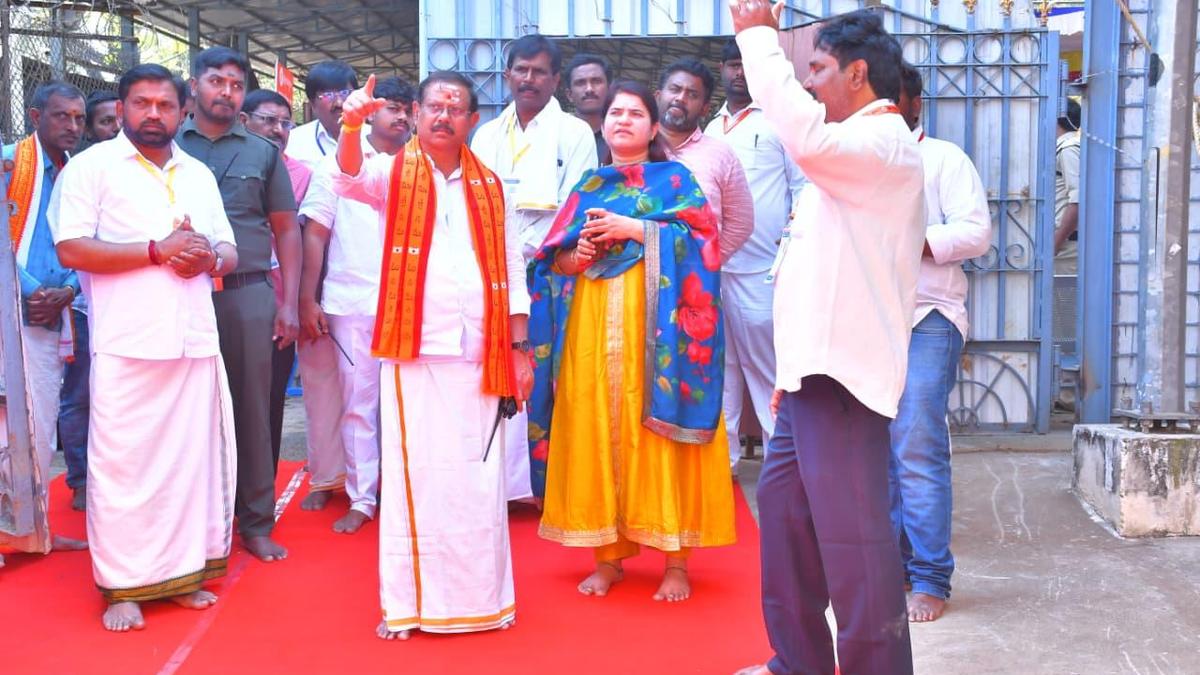 Collector Rajakumari Ganiya and temple executive officer M. Srinivasa Rao reviewing the arrangements for ‘Pagalankarana ritual’ to be held on Maha Sivaratri at Srisailam temple on Saturday.