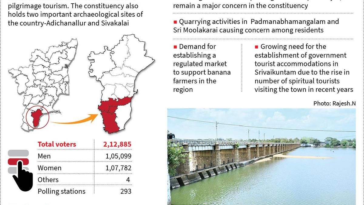 With the upcoming Assembly elections fast approaching, the Srivaikuntam constituency, home to the country’s significant archaeological sites, Adichanallur and Sivakalai, is gearing up for the contest between a Dravidian party (AIADMK) and a national party (Indian National Congress). Srivaikuntam town which has witnessed a rise in pilgrimage tourism in recent years, continues to await basic infrastructure facilities such as well maintained roads, clean drinking water and proper sewage system. S. Kannan, a CITU member from Srivaikuntam said that the town is in dire need of infrastructure improvements, stating, “the Perumal Koil Road was laid a year ago. However, it is already badly damaged and requires immediate restoration.” He added that hundreds of tourists visit the Sri Vaikuntha Perumal Temple every day, yet there were no proper restroom facilities for women near the temple. “The old Srivaikuntam court building has been in a dilapidated state for many years. Multiple petitions have been submitted to the government to use the space for construction of lodging facilities for tourists. However no action has been taken regarding this,” he said He also pointed out the concerns over drinking water supply. According to him, water was being sourced directly from the Tamirabharani river to overhead tanks without adequate filtration. “One can see resin like substance floating in the stored water, making it unsafe and uncomfortable to drink,” Mr. Kannan explained. The constituency has 293 polling stations and has a total of 2,12,885 voters. This includes 1,05,099 men, 1,07,782 women and four others, following the completion of the recent Special Intensive Revision (SIR) process in Tamil Nadu. For the upcoming Assembly election, AIADMK has fielded S. P. Shanmuganathan. The Congress is contesting as part of the Secular Progressive Alliance led by DMK. Another major grievance echoed across some of the parts of constituency such as Padmanabhamangalam and Sri Moolakarai near Srivaikuntam was quarrying, which was causing high concern among the residents. A resident from Sri Moolakarai village panchayat, predominantly inhabited by Scheduled Caste people said that the residents were suffering because of quarrying near the village due to heavy movement of mineral laden trucks and pollution affecting the agricultural lands and health condition of the people. “Several times these trucks have fatally knocked our livestocks and many times villagers staged road blockade protests. However, after a few days, the same route is reused for for the transportation of minerals,” the resident added. It is to be noted that in September 2025, during a public hearing in Petmanagar on setting a stone quarry at Sri Moolakarai in the district triggered heater argument between supporters of quarry owner and farmers, who fiercely opposed mining permission granted to Nainar Balaji, eldest son of Tamil Nadu BJP President Nainar Nagenthran. Anitha (name changed), a resident of Sri Moolakarai highlighted the lack of transportation facilities. She said villagers are forced to walk nearly three kilometres to Petmanagar for school and other essential services. “The village has around 200 households and residents are still waiting for regular bus service even today,” she said. Karthikeyan, a resident of Sathankulam stressed the need to widen Sathankulam main road, at least near the bus stand, citing severe traffic congestion especially during holidays and night. He added that a large number of private omni buses to Chennai, Bengaluru and Coimbatore parked outside the Sathankulam bus stand to board passengers, worsening the congestion. The Srivaikuntam region has extensive agricultural land known for banana cultivation. Farmers believe that establishing a regulated market or banana based industry would greatly benefit them. Shanmugasundaram, a farmer from Sivakalai recalled that plans for banana powder industry in the region were announced nearly a decade ago but never materialised. He said that Vadakaal irrigation region alone has around 25,000 acres of banana fields and farmers struggle to sell their produce as local traders procure from Sathyamangalam region instead. “The establishment of a regulated market or banana based processing industry would be highly beneficial for farmers,” he added. In the constituency, residents continue to voice over lack of basic infrastructure, environmental issues and livelihood challenges. Addressing these long pending demands will be crucial in shaping both voter sentiment and the region’s future development. Published – April 02, 2026 09:14 pm IST Share this: Click to share on WhatsApp (Opens in new window) WhatsApp Click to share on Facebook (Opens in new window) Facebook Click to share on Threads (Opens in new window) Threads Click to share on X (Opens in new window) X Click to share on Telegram (Opens in new window) Telegram Click to share on LinkedIn (Opens in new window) LinkedIn Click to share on Pinterest (Opens in new window) Pinterest Click to email a link to a friend (Opens in new window) Email More Click to print (Opens in new window) Print Click to share on Reddit (Opens in new window) Reddit Click to share on Tumblr (Opens in new window) Tumblr Click to share on Pocket (Opens in new window) Pocket Click to share on Mastodon (Opens in new window) Mastodon Click to share on Nextdoor (Opens in new window) Nextdoor Click to share on Bluesky (Opens in new window) Bluesky Like this:Like Loading... Post navigation France bans planned gathering of Muslims in Paris area, citing security risk Trump ‘controlling’ Modi, claims Rahul Gandhi in Assam election rally