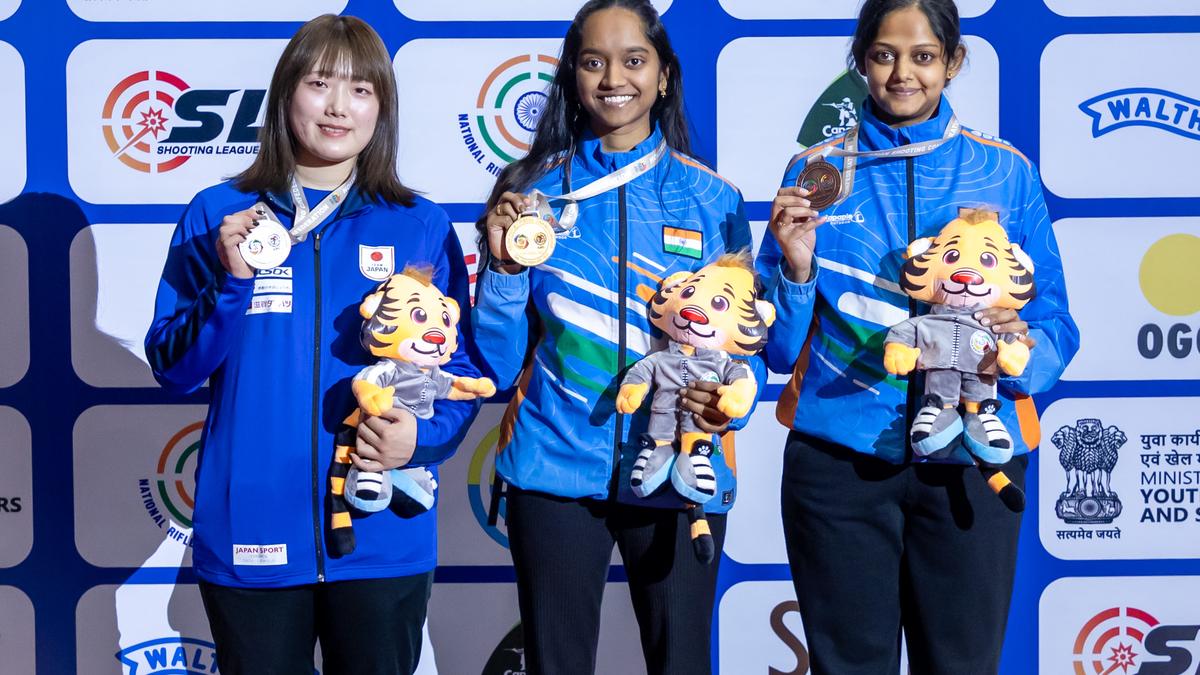 On the podium: Elavenil and Meghana, right, the 10m air rifle gold and bronze medallists, with silver winner Misaki, left. | Photo Credit: Special Arrangement Elavenil Valarivan held off the challenge from Japan’s Misaki Nobata to clinch the women’s 10m air rifle gold in the Asian rifle/ pistol championships at the Dr. Karni Singh Shooting Range here on Saturday. Meghana Sajjanar joined Elavenil on the podium after securing the bronze. Shambhavi Kshirsagar, meanwhile, broke the Asian finals record on her way to winning gold in the junior women’s category. Manyata Singh and Aneesha Sharma, along with Shambhavi, ensured India swept the podium in this category. India racked up 10 gold medals on the fourth day. The host’s overall tally grew to 43 medals, including 27 gold, 10 silver and eight bronze. Ojasvi Thakur secured gold in the women’s youth category. India started the day by sweeping the 50m men’s pistol podium with Saurabh Chaudhary winning the gold. Kamaljeet Chaudhary and Ravinder Singh bagged silver and bronze, respectively. Elavenil was placed fifth after the end of the second series, but gradually clawed her way back into the lead by the 18th shot. She kept her composure until the end to remain at the top of the pack. In the junior 10m air rifle finals, Shambhavi finished with 253.7. She was at her best from the start, and her last eight shots read 10.7, 10.7, 10.8, 10.8, 10.9, 10.5, 10.9 and 10.7. Published – February 07, 2026 06:44 pm IST Share this: Click to share on WhatsApp (Opens in new window) WhatsApp Click to share on Facebook (Opens in new window) Facebook Click to share on Threads (Opens in new window) Threads Click to share on X (Opens in new window) X Click to share on Telegram (Opens in new window) Telegram Click to share on LinkedIn (Opens in new window) LinkedIn Click to share on Pinterest (Opens in new window) Pinterest Click to email a link to a friend (Opens in new window) Email More Click to print (Opens in new window) Print Click to share on Reddit (Opens in new window) Reddit Click to share on Tumblr (Opens in new window) Tumblr Click to share on Pocket (Opens in new window) Pocket Click to share on Mastodon (Opens in new window) Mastodon Click to share on Nextdoor (Opens in new window) Nextdoor Click to share on Bluesky (Opens in new window) Bluesky Like this:Like Loading... Post navigation Bird flu outbreak in Tamil Nadu triggers panic in Andhra Pradesh Experts emphasise need for more practical learning