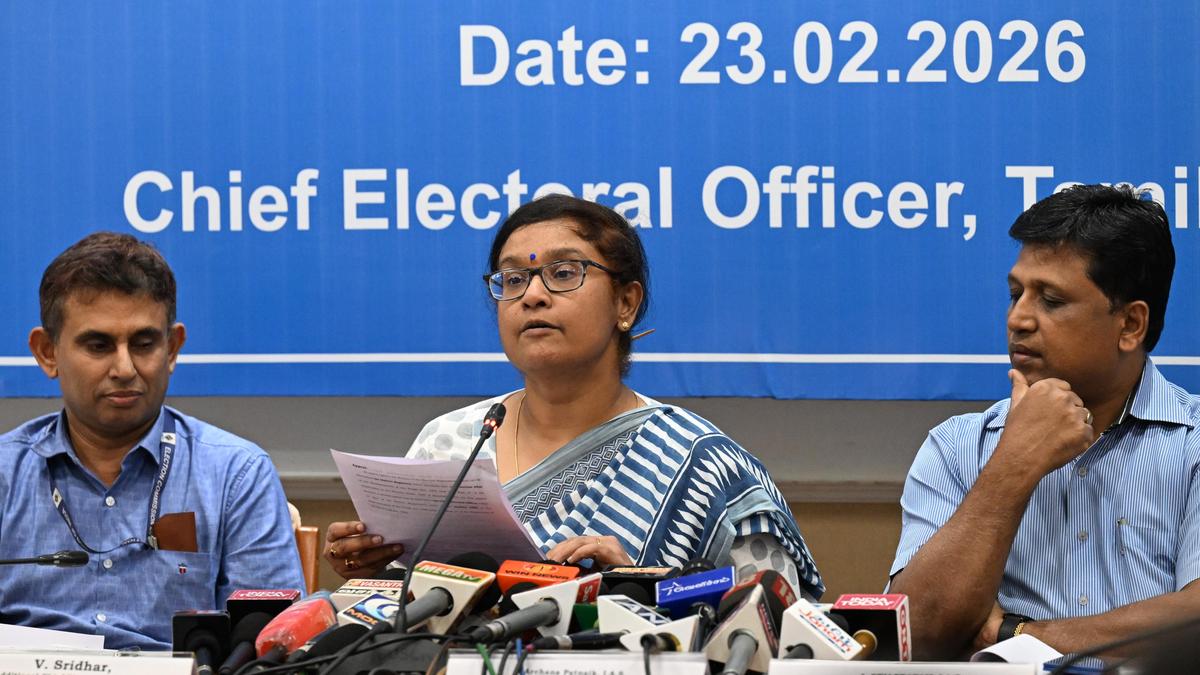 Tamil Nadu Chief Electoral Officer (CEO) Archana Patnaik addressing the media after the publication of final electoral roll following the conduct of Special intensive Revision (SIR) across the State, at the Secretariat in Chennai on February 23, 2026.