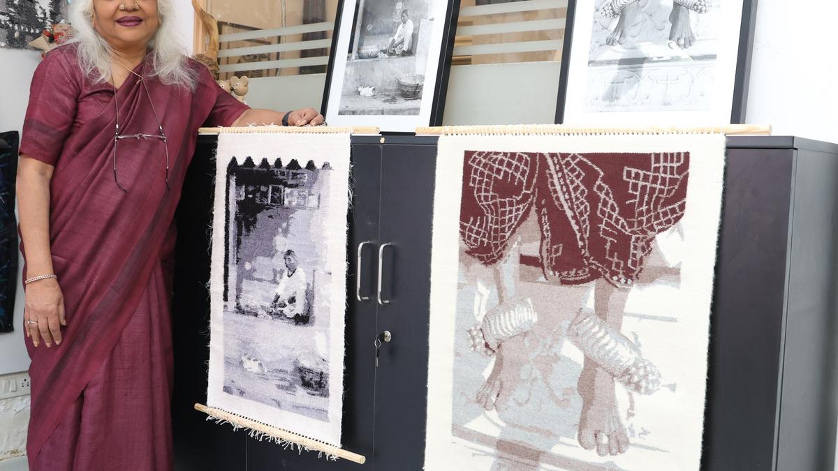 For the exhibition, she has selected a few of her father’s photographs from the negatives she has preserved and digitised over the years. Displayed alongside each image are her textile and paper interpretations — woven tapestries, miniature embroideries and delicate works on tea-stained paper that echo the original compositions. In total, 82 pieces are on display, forming a visual dialogue between photograph, thread and memory.
