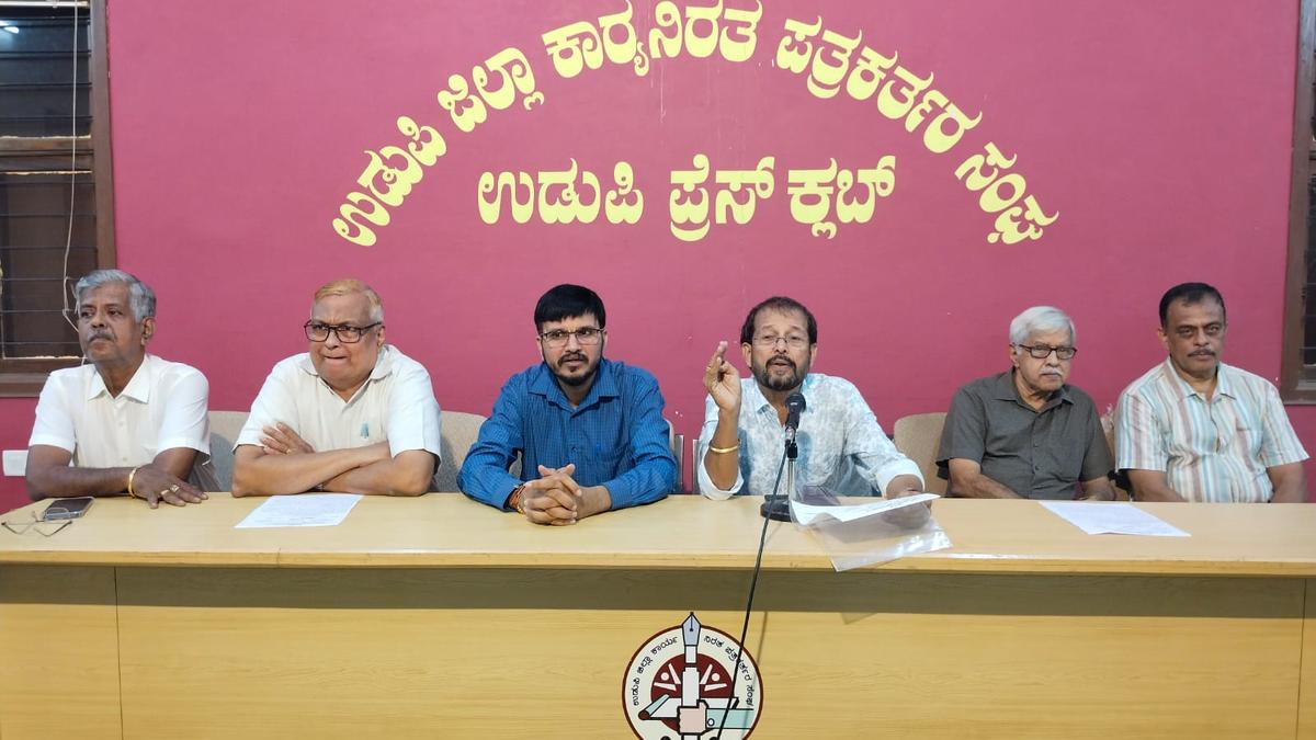 Udupi Taluk Brahmana Maha Sabha President Srikanth Upadhyaya speaks to reporters in Udupi on Friday.