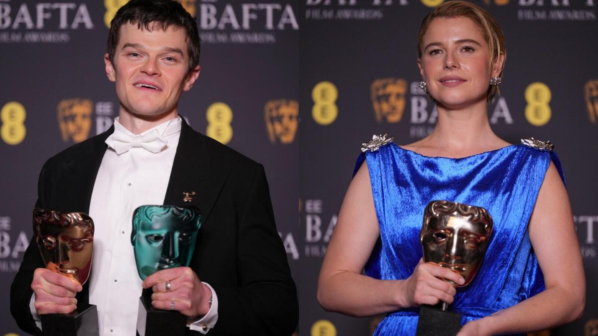 Robert Aramayo and Jessie Buckley posing after winning the BAFTA for Best Actor and Best Actress respectively