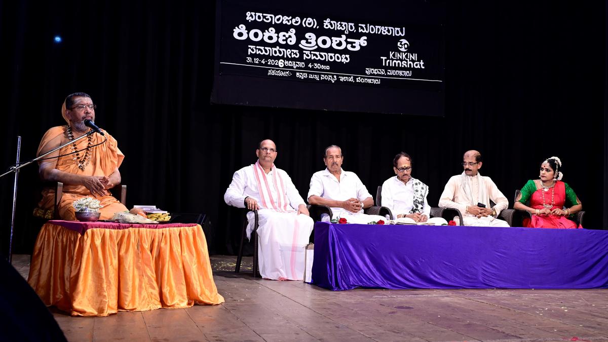 Edneer Mutt seer Sachhidananda Bharati speaking at the valedictory of the Kinkini Trimshat, 30th anniversary celebrations of Bharatanjali Nrutya Samsthe, in Mangaluru on Monday. | Photo Credit: SPECIAL ARRANGEMENT Edneer Mutt Seer Sachhidananda Bharati on Monday, said, Bharatanatyam is a fusion of body, mind and soul which can take a person towards divine realisation. He was speaking at the valedictory of Kinkini Trimshath, the 30th anniversary celebrations of Bharatanjali Nrutya Samsthe, Mangaluru, here. He congratulated Sridhar Holla and Pratima Holla, founders of the dance school for their three decades’ long service to art and culture and noted that the couple has been the disciples of the Mutt for long. Published – April 14, 2026 08:15 pm IST Share this: Click to share on WhatsApp (Opens in new window) WhatsApp Click to share on Facebook (Opens in new window) Facebook Click to share on Threads (Opens in new window) Threads Click to share on X (Opens in new window) X Click to share on Telegram (Opens in new window) Telegram Click to share on LinkedIn (Opens in new window) LinkedIn Click to share on Pinterest (Opens in new window) Pinterest Click to email a link to a friend (Opens in new window) Email More Click to print (Opens in new window) Print Click to share on Reddit (Opens in new window) Reddit Click to share on Tumblr (Opens in new window) Tumblr Click to share on Pocket (Opens in new window) Pocket Click to share on Mastodon (Opens in new window) Mastodon Click to share on Nextdoor (Opens in new window) Nextdoor Click to share on Bluesky (Opens in new window) Bluesky Like this:Like Loading... Post navigation Pilot project approved to develop, allot sites for poor from SCs, STs A.P. police arrest over 1,340 for posting ‘derogatory remarks, objectionable content’ on social media