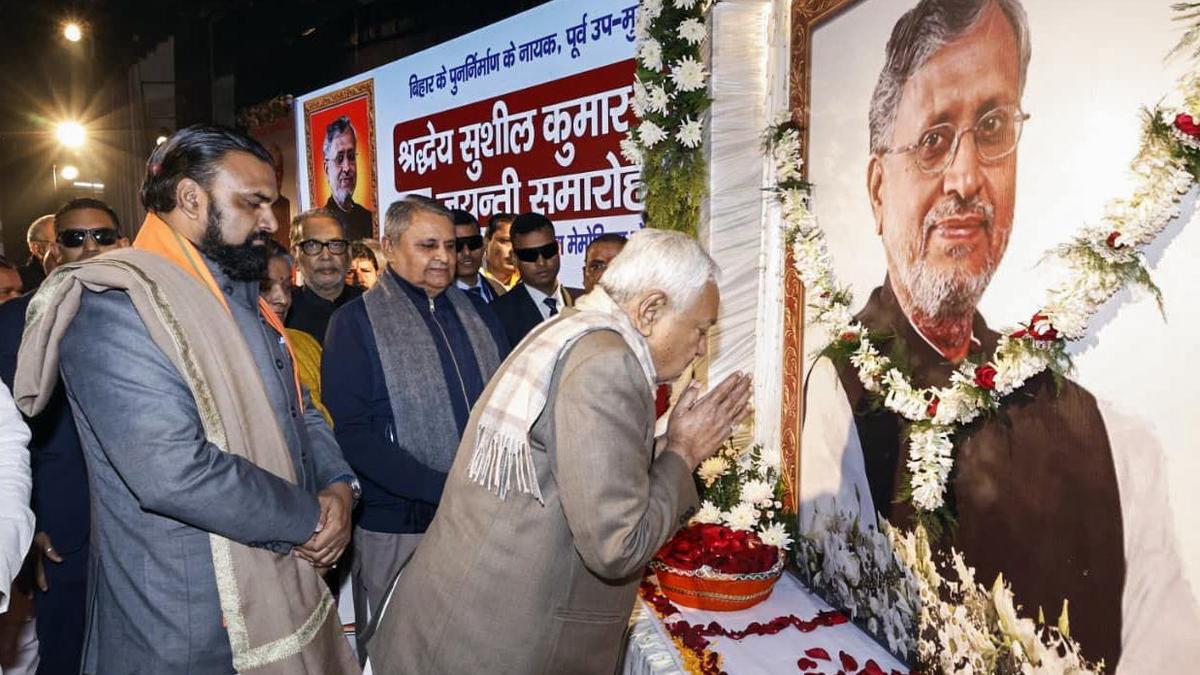 Bihar Chief Minister Nitish Kumar pays tribute to the former Bihar Deputy Chief Minister Sushil Kumar Modi on his birth anniversary during the programme at Shri Krishna Memorial Hall, in Patna on January 5, 2026. Bihar Deputy Chief Minister Samrat Chaudhary is also present. Photo: @NitishKumarX/ANI Photo
