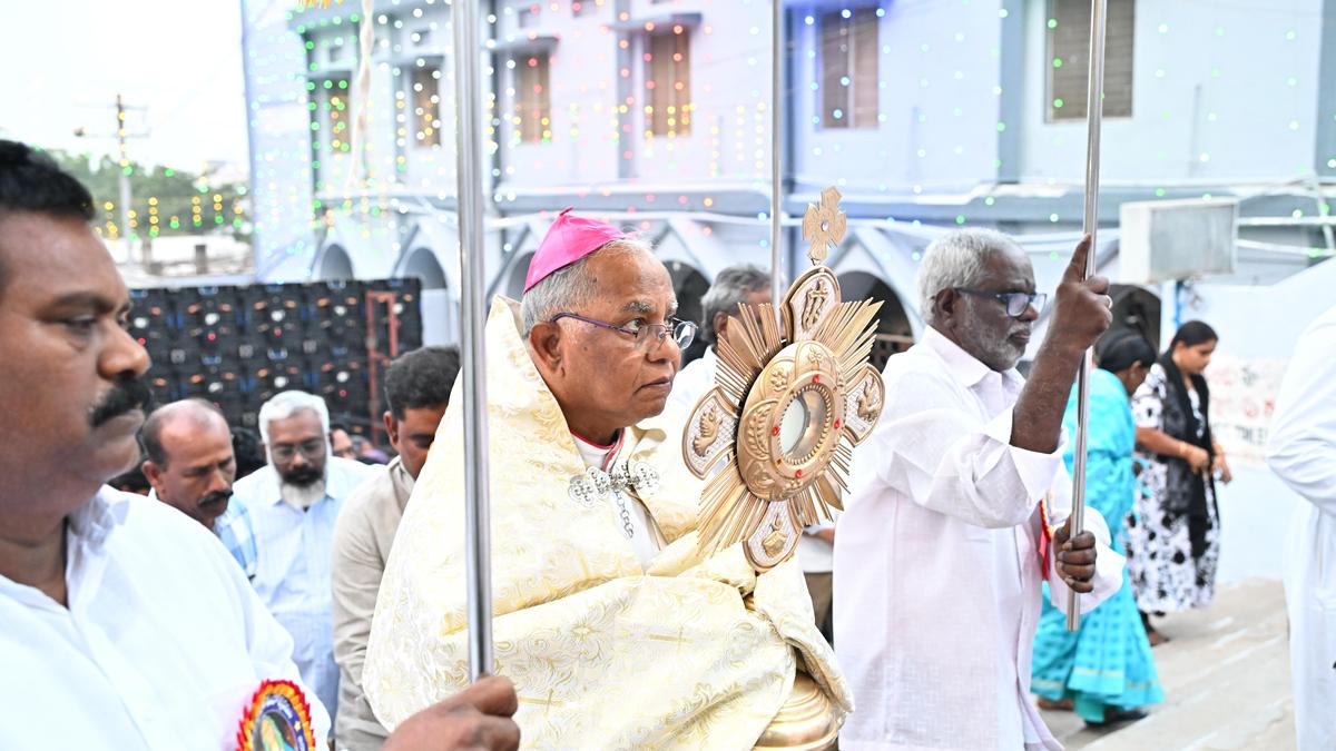 Vijayawada Catholic Diocese Bishop Telagathoti Joseph Raja Rao carrying the cross alongside devotees and taking out a procession to the hill top to mark the beginning of nine-day prayers as part of the holy communal at the Gunadala Mother Mary Shrine in Vijayawada, on Saturday. | Photo Credit: K.V.S. GIRI The 102nd Navadina Japalu of Gunadala Matha Shrine began amid prayers at Gunadala hill here on Saturday. Vijayawada Catholic Diocese Bishop Telagathoti Joseph Raja Rao, monsignore Muvvala Prasad, vicar general Mesapam Gabriel, Gunadala temple rector Yeleti William Jayaraju and others hoisted the Mariya Matha flag at the temple on the occasion. In his message to the devotees, the Bishop said the Gunadala shrine, the second largest church in South India, was celebrating the 102 Utsavams, and thousands of devotees were expected to attend the festival. Later, the Bishop, along with Fr. Kolakani Mariyanna, Social Services director Fr. Thota Sunil Raju and other priests offered ‘Divya Balipuja’ to Mary Matha. Gunadala church management has made elaborate arrangements for the devotees attending the utsavams, Mr. William Jayaraju said. Published – January 31, 2026 10:53 pm IST Share this: Click to share on WhatsApp (Opens in new window) WhatsApp Click to share on Facebook (Opens in new window) Facebook Click to share on Threads (Opens in new window) Threads Click to share on X (Opens in new window) X Click to share on Telegram (Opens in new window) Telegram Click to share on LinkedIn (Opens in new window) LinkedIn Click to share on Pinterest (Opens in new window) Pinterest Click to email a link to a friend (Opens in new window) Email More Click to print (Opens in new window) Print Click to share on Reddit (Opens in new window) Reddit Click to share on Tumblr (Opens in new window) Tumblr Click to share on Pocket (Opens in new window) Pocket Click to share on Mastodon (Opens in new window) Mastodon Click to share on Nextdoor (Opens in new window) Nextdoor Click to share on Bluesky (Opens in new window) Bluesky Like this:Like Loading... Post navigation BJP demands Supreme Court-monitored SIT probe into Anandapur warehouse fire Yelahanka flyover must be ready by September end: GBA chief