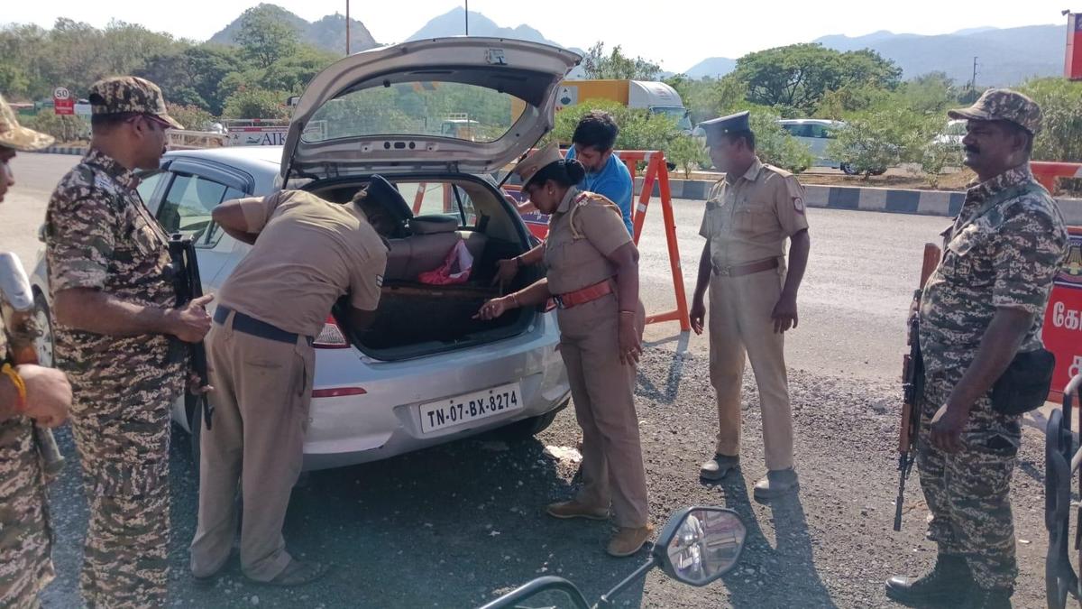 A vehicle being checked by the Coimbatore District Police at Walayar inter-State border. | Photo Credit: SPECIAL ARRANGEMENT The police have stepped up vigil in all border checkposts of Coimbatore district in view of the approaching Assembly election, to curb possible circulation of unaccounted cash, freebies, liquor, weapons, explosives and contraband substances. The police sources said that special focus was being given to inter-State checkposts bordering the Palakkad and Thrissur districts of Kerala. Published – April 10, 2026 10:05 pm IST Share this: Click to share on WhatsApp (Opens in new window) WhatsApp Click to share on Facebook (Opens in new window) Facebook Click to share on Threads (Opens in new window) Threads Click to share on X (Opens in new window) X Click to share on Telegram (Opens in new window) Telegram Click to share on LinkedIn (Opens in new window) LinkedIn Click to share on Pinterest (Opens in new window) Pinterest Click to email a link to a friend (Opens in new window) Email More Click to print (Opens in new window) Print Click to share on Reddit (Opens in new window) Reddit Click to share on Tumblr (Opens in new window) Tumblr Click to share on Pocket (Opens in new window) Pocket Click to share on Mastodon (Opens in new window) Mastodon Click to share on Nextdoor (Opens in new window) Nextdoor Click to share on Bluesky (Opens in new window) Bluesky Like this:Like Loading... Post navigation West Bengal election: Across party lines in Jhargram, poll promises seek to woo adivasi, Dalit voters Have worked very hard on my bowling and fitness: Natarajan