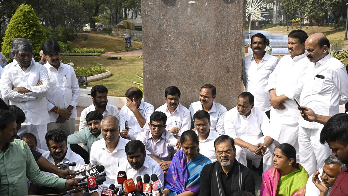 Bharat Rashtra Samithi (BRS) MLAs stage a protest at Gun Park after boycotting the Telangana State Legislative Assembly session in Hyderabad on Friday (January 2, 2026) | Photo Credit: RAMAKRISHNA G The Bharat Rashtra Samithi (BRS) announced a complete boycott of the ongoing winter session of Telangana Assembly, alleging unilateral conduct by the Speaker and undemocratic behaviour of the Congress government. After staging a walkout from the House on Friday (January 2, 2026), BRS legislators held a protest at Gun Park, where former Minister T. Harish Rao addressed the media and alleged that opposition members were humiliated and their rights snatched. It was evident the way they were made to wait for over an hour for the Business Advisory Committee (BAC) meeting, he said, accusing the Speaker of distorting the agreed minutes related to the duration of the Assembly session. Mr. Harish Rao claimed that the microphones of BRS members were switched off during Question Hour when they attempted to question the Government, calling it a direct assault on democratic norms. “If questioning the Chief Minister is not allowed, there is no purpose in convening the Assembly,” he said. The former Minister also accused the Chief Minister A. Revanth Reddy of using inappropriate language and indulging in body-shaming on the floor of the House. He alleged that the Assembly was being run like a party office rather than a legislative forum. Referring to the Musi River Rejuvenation issue, Mr. Harish Rao said the BRS was ready for a full-fledged discussion and questioned the Government’s silence on key issues, including compensation for displaced families and the use of Godavari water. He highlighted that the previous BRS government had constructed 32 sewage treatment plants and sent proposals for 39 more to the Centre. He said Congress leader Rahul Gandhi publicly carries the Constitution, while ignoring the Telangana government’s actions, which Mr. Rao claimed were undemocratic and undermining the Telangana Assembly. Alleging that the Assembly Speaker was showing signs of bias while the government was full of arrogance, the BRS leader announced that the party would boycott the Assembly session. Published – January 02, 2026 06:20 pm IST Share this: Click to share on WhatsApp (Opens in new window) WhatsApp Click to share on Facebook (Opens in new window) Facebook Click to share on Threads (Opens in new window) Threads Click to share on X (Opens in new window) X Click to share on Telegram (Opens in new window) Telegram Click to share on LinkedIn (Opens in new window) LinkedIn Click to share on Pinterest (Opens in new window) Pinterest Click to email a link to a friend (Opens in new window) Email More Click to print (Opens in new window) Print Click to share on Reddit (Opens in new window) Reddit Click to share on Tumblr (Opens in new window) Tumblr Click to share on Pocket (Opens in new window) Pocket Click to share on Mastodon (Opens in new window) Mastodon Click to share on Nextdoor (Opens in new window) Nextdoor Click to share on Bluesky (Opens in new window) Bluesky Like this:Like Loading... Post navigation APSIDC to focus on lift irrigation schemes: Director BJP leader condemns ‘attack’ on Gali Janardhan Reddy in Karnataka