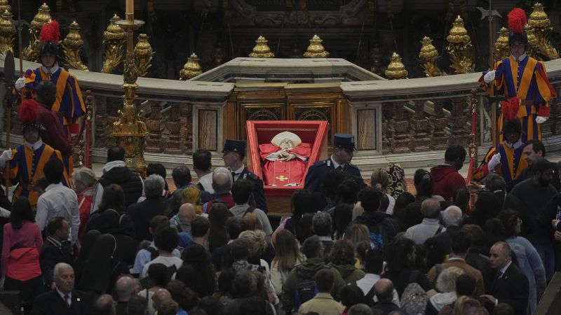 Vatican City CNN — Pope Francis’ wooden coffin is to be sealed on Friday night, in a private rite that officially ends three days of his body lying in state at the Vatican. About 250,000 people filed through St. Peter’s Basilica to pay their final respects to Francis, who was the first pope from Latin America and the first from the Jesuit order. The liturgical rite of sealing his coffin is being led by the Cardinal Camerlengo Kevin Farrell, the acting head of the church, who is tasked with making arrangements for the pope’s funeral. Farrell, a Dublin-born cleric who became a naturalized American citizen, was formerly the Bishop of Dallas, in Texas. Other church officials will assist, including the Venezuelan archbishop, the Brazilian prelate and the late pope’s secretaries. A US cardinal accused of mismanaging clerical sexual abuse – the retired archbishop of Los Angeles, Cardinal Roger Mahony – has also been listed as playing an official role. The ceremony, which will take place behind closed doors, includes several short songs, spoken prayers and a moment for silent prayer. Farrell will spread a white silk veil over the late pope’s face and sprinkle the body with holy water, according to an order of service released by the Vatican press office earlier this week. In keeping with tradition, the camerlengo will place several possessions inside the coffin before sealing it, including the pope’s pallium – the long white robe he wore – coins minted during his pontificate and a deed summarizing the highlights of his tenure. The rite will conclude with a hymn to Mary. As part of Francis’ push to simplify the papal funeral rites, his body is in a single wooden coffin, rather than having three nested coffins of cypress, lead and oak as was tradition. Outside the basilica, the streets leading to the Vatican were much busier on Friday afternoon than they were earlier in the week, with thousands joining the line to file past the coffin before the church closed to the public at 7 p.m. local time (1 p.m. ET). Friday marks the fourth day of national mourning in Italy and a public holiday – Liberation Day – meaning many locals had more time to join the line. Others traveled from much farther away following news of the pope’s death. “It was wonderful to see him,” said Joana Veiga, from Porto, Portugal, who arrived with her sister in the morning. “It was very peaceful – calm.” Her sister missed a chance to see Francis last year in Portugal, and was thankful that they made it in time for his lying in state. Pope Francis’ funeral will take place on Saturday on the steps outside of St. Peter’s Basilica at 10 a.m. local time (4 a.m. ET). That will mark the beginning of the ancient tradition of the Novemdiales, nine days of mourning for the deceased pope during which funeral Masses are held each day inside the basilica. His final resting place, in Rome’s Basilica di Santa Maria Maggiore, will also be simple in style. It will be made of marble from Liguria, northern Italy, where his great-grandfather was from. He asked that the tomb not have ornate decoration, instead only including an image of the cross he wore as Archbishop of Buenos Aires and the Latin inscription of his papal name: Franciscus. CNN’s James Frater contributed to this report. Share this: Click to share on WhatsApp (Opens in new window) WhatsApp Click to share on Facebook (Opens in new window) Facebook Click to share on Threads (Opens in new window) Threads Click to share on X (Opens in new window) X Click to share on Telegram (Opens in new window) Telegram Click to share on LinkedIn (Opens in new window) LinkedIn Click to share on Pinterest (Opens in new window) Pinterest Click to email a link to a friend (Opens in new window) Email More Click to print (Opens in new window) Print Click to share on Reddit (Opens in new window) Reddit Click to share on Tumblr (Opens in new window) Tumblr Click to share on Pocket (Opens in new window) Pocket Click to share on Mastodon (Opens in new window) Mastodon Click to share on Nextdoor (Opens in new window) Nextdoor Click to share on Bluesky (Opens in new window) Bluesky Like this:Like Loading... Post navigation Trump’s MOVE Ignites DEM Civil War Mother and son who helped expose ‘extermination camp’ killed in Jalisco, Mexico