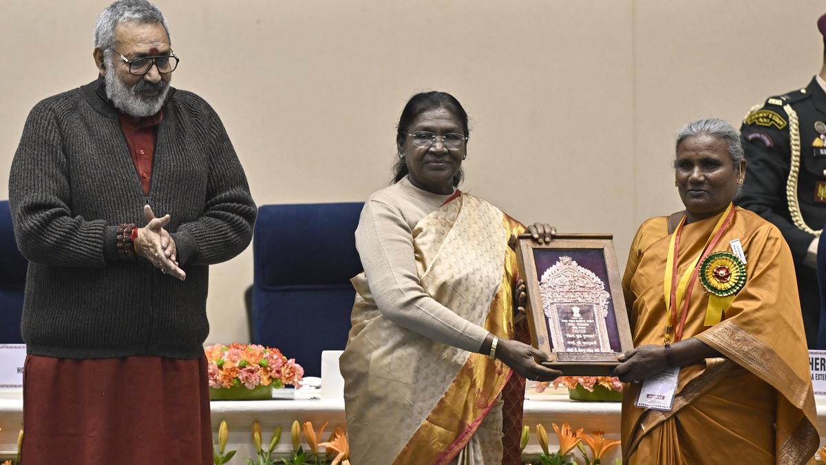 D. Sivamma receiving the Shilp Guru Award for leather puppetry from President Droupadi Murmu in 2025. | Photo Credit: File Photo The recipients of the State government’s Ugadi awards include Mannava Satyanarayana, a retired Telugu professor and HoD in Acharya Nagarjuna University, who held the distinction of being the first visually impaired individual in India to achieve a Ph.D. at the national level in the field of literature, and Satyavada Raghunadhamma and Satyavada Suryakumari (Satyavada Sisters), both visually impaired from birth, but have been widely acclaimed Carnatic vocal musicians and prolific writers, who published around 125 stories in various magazines by dictating their thoughts to others. D. Sivamma, an expert in leather puppetry, who transformed the performance – only art into a globally recognised handicraft and whose efforts thereof helped 1,000 artists in securing livelihood. She had won the Shilp Guru Award, the highest honour in the handicrafts sector in 2023. Surada Prasad, who created history as the first fisherman’s son to win the Sahitya Akademi Yuva Puraskar in 2025 in the field of literature, and Tamogna Mothukuri from Gudivada who, at just five years of age, conquered the icy waters of Lake Bodensee, swimming 6.3 km nonstop across Germany and Austria in under four hours. Gowrabathini Ramanaiah, a legendary weaver from Venkatagiri, who holds a UNESCO Certificate of Excellence handloom weaving, Chadalavada Kiran Kumar and Chadalavada Sarath Babu of Anuradha Timbers International, who did the door works for the Ayodhya Ram Mandir, and Tappetagullu artiste Neelabonu Satyam, who trained youth from 35 villages across three districts, mentoring 15 individuals to become independent Gurus themselves. Gorrela Krishna Murthy, an exponent of Burrakatha, who gave 5,000 shows across India and in various countries, including Malaysia, Singapore, Sri Lanka, Dubai, and Bahrain, and painter Kalasagar Yellapu, whose book titled, ‘Art of Andhra Pradesh’, won accolades. Published – March 19, 2026 09:10 pm IST Share this: Click to share on WhatsApp (Opens in new window) WhatsApp Click to share on Facebook (Opens in new window) Facebook Click to share on Threads (Opens in new window) Threads Click to share on X (Opens in new window) X Click to share on Telegram (Opens in new window) Telegram Click to share on LinkedIn (Opens in new window) LinkedIn Click to share on Pinterest (Opens in new window) Pinterest Click to email a link to a friend (Opens in new window) Email More Click to print (Opens in new window) Print Click to share on Reddit (Opens in new window) Reddit Click to share on Tumblr (Opens in new window) Tumblr Click to share on Pocket (Opens in new window) Pocket Click to share on Mastodon (Opens in new window) Mastodon Click to share on Nextdoor (Opens in new window) Nextdoor Click to share on Bluesky (Opens in new window) Bluesky Like this:Like Loading... Post navigation Hyderabad Police launch H-FAST unit to curb food adulteration in city Congress under fire as Dalit collective slams broken promises on tickets