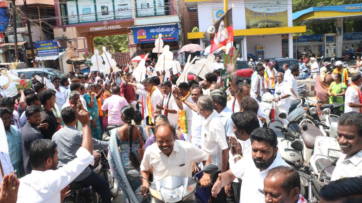DMK and AIADMK functionaries vied with each other to canvass votes in front of St. Mary’s Higher Secondary School where polling officials where casting postal ballot in Dindigul on Saturday. | Photo Credit: KARTHIKEYAN G Chaos ensued at St. Mary’s Higher Secondary School in Dindigul on Saturday where the postal voting for officials engaged in polling duty was under way after functionaries of various political parties attempted to canvass votes for their candidates on the school premises. Postal voting for the polling officials began on Saturday. Necessary arrangements had been made at the centres across the seven Assembly constituencies to ensure that the officials cast their votes adhering to the guidelines issued by the Election Commission of India. Published – April 18, 2026 08:10 pm IST Share this: Click to share on WhatsApp (Opens in new window) WhatsApp Click to share on Facebook (Opens in new window) Facebook Click to share on Threads (Opens in new window) Threads Click to share on X (Opens in new window) X Click to share on Telegram (Opens in new window) Telegram Click to share on LinkedIn (Opens in new window) LinkedIn Click to share on Pinterest (Opens in new window) Pinterest Click to email a link to a friend (Opens in new window) Email More Click to print (Opens in new window) Print Click to share on Reddit (Opens in new window) Reddit Click to share on Tumblr (Opens in new window) Tumblr Click to share on Pocket (Opens in new window) Pocket Click to share on Mastodon (Opens in new window) Mastodon Click to share on Nextdoor (Opens in new window) Nextdoor Click to share on Bluesky (Opens in new window) Bluesky Like this:Like Loading... Post navigation Contest brewing between former and present cadres of AIADMK in Orathanadu constituency BJP wants to have a puppet AIADMK Chief Minister, says Rahul Gandhi