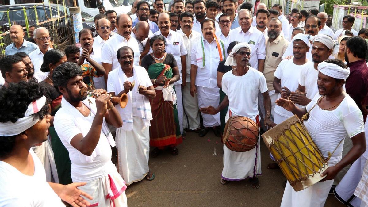Residents of Akalad, Punnayur, welcome senior Congress leader Ramesh Chennithala during the Gandhi Gramam programme on Thursday.