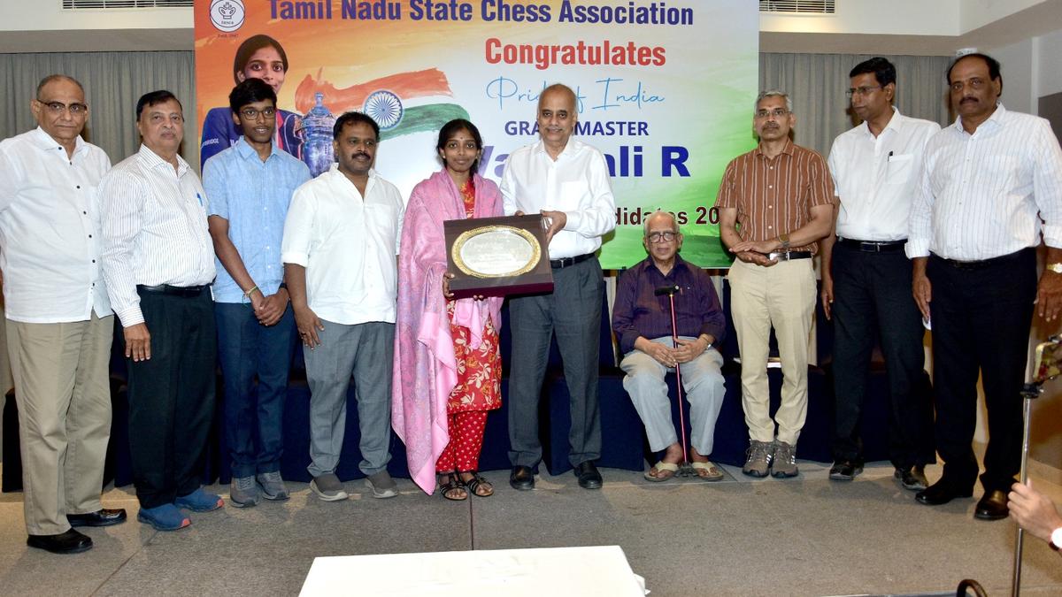 Vaishali being felicitated by TNSCA president M. Manickam in the presence of Manuel Aaron, coach R.B. Ramesh, R. Praggnanandhaa, Velammal’s M.V.M. Velmohan and other dignitaries. | Photo Credit: Special Arrangement R. Vaishali has been the toast of the chess fraternity in the country after she phenomenally broke through to win the FIDE Women’s Candidates title. The Chennai Grandmaster remains unaffected by the adulation and attention she has been receiving. It wasn’t any different at a felicitation function got up by the Tamil Nadu State Chess Association, even as she was swarmed by school children and players, and she tried to oblige every request for an autograph or selfie. Published – April 20, 2026 10:49 pm IST Share this: Click to share on WhatsApp (Opens in new window) WhatsApp Click to share on Facebook (Opens in new window) Facebook Click to share on Threads (Opens in new window) Threads Click to share on X (Opens in new window) X Click to share on Telegram (Opens in new window) Telegram Click to share on LinkedIn (Opens in new window) LinkedIn Click to share on Pinterest (Opens in new window) Pinterest Click to email a link to a friend (Opens in new window) Email More Click to print (Opens in new window) Print Click to share on Reddit (Opens in new window) Reddit Click to share on Tumblr (Opens in new window) Tumblr Click to share on Pocket (Opens in new window) Pocket Click to share on Mastodon (Opens in new window) Mastodon Click to share on Nextdoor (Opens in new window) Nextdoor Click to share on Bluesky (Opens in new window) Bluesky Like this:Like Loading... Post navigation Poll bugle to fall silent across Tamil Nadu on Tuesday evening Allahabad HC judge recuses from Rahul Gandhi citizenship case, censures petitioner over social media posts