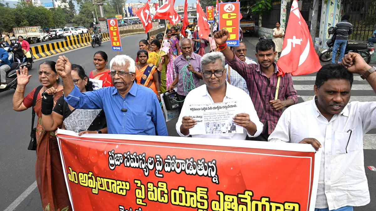 CITU State general secretary Ch. Narasinga Rao and other leaders taking out a rally, demanding withdrawal of PD Act imposed against Rythu Sangham leader M. Appalaraju, in Visakhapatnam on Sunday.