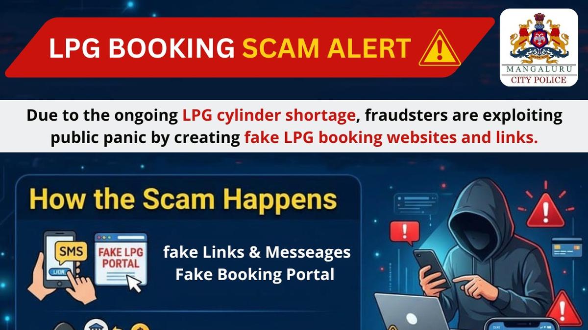 A social media post by Mangaluru City Police cautioning people about the LPG gas booking scam. | Photo Credit: Supplied by photo The Mangaluru City Police have cautioned people about fraudsters’ use of fake links for the booking of LPG cylinders. In a post on the Instagram page mangalurucitypoliceofficial, police said fraudsters were creating fake LPG booking links and websites and asking for advance payment for the LPG cylinders. The victims find that they have been cheated only when the cylinders are not delivered. Published – March 14, 2026 06:25 pm IST Share this: Click to share on WhatsApp (Opens in new window) WhatsApp Click to share on Facebook (Opens in new window) Facebook Click to share on Threads (Opens in new window) Threads Click to share on X (Opens in new window) X Click to share on Telegram (Opens in new window) Telegram Click to share on LinkedIn (Opens in new window) LinkedIn Click to share on Pinterest (Opens in new window) Pinterest Click to email a link to a friend (Opens in new window) Email More Click to print (Opens in new window) Print Click to share on Reddit (Opens in new window) Reddit Click to share on Tumblr (Opens in new window) Tumblr Click to share on Pocket (Opens in new window) Pocket Click to share on Mastodon (Opens in new window) Mastodon Click to share on Nextdoor (Opens in new window) Nextdoor Click to share on Bluesky (Opens in new window) Bluesky Like this:Like Loading... Post navigation Over 6,700 connections given under 24×7 water project in Tiruchi Nigerian national deported for eight-year illegal stay in India