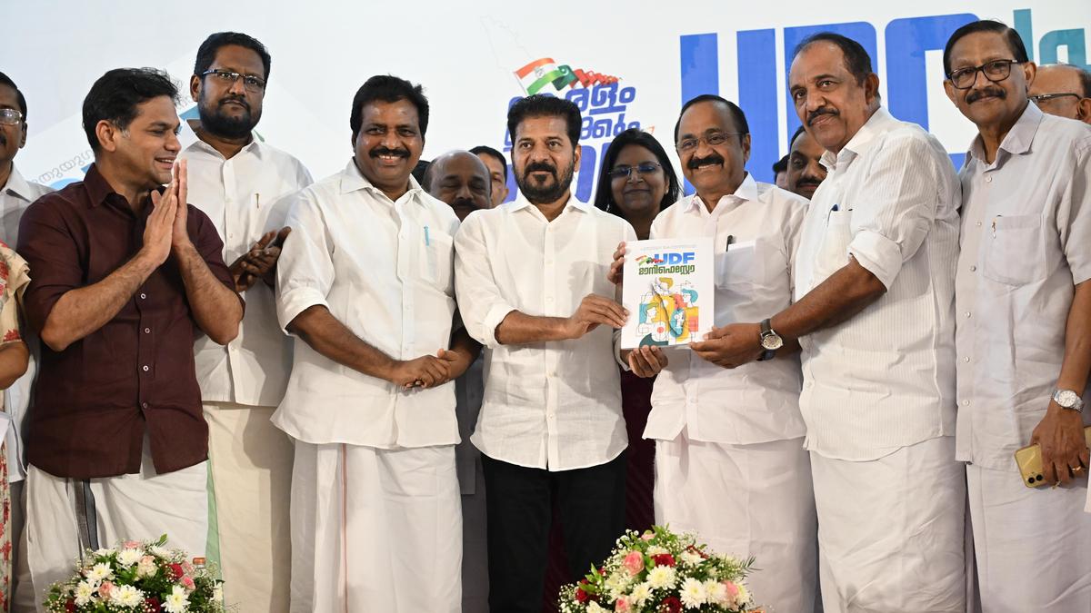 Chief Minister A. Revanth Reddy, Kerala opposition leader V.D Satheesan, Congress MPs Benny Behanan, Hibi Eden and others at the release of the United Democratic Front’s manifesto for Kerala polls, in Kochi, Keralam, on Thursday. | Photo Credit: THULASI KAKKAT KCR and Pinrayi Vijayan families are unbridled corrupt, besides being despotic, says Revanth Reddy while releasing UDF election manifesto in Keralam Chief Minister A. Revanth Reddy on Thursday launched a broadside against the opposition parties for criticising the guarantees announced by the United Democratic Front (UDF) in the election manifesto in Keralam. The Chief Minister challenged the political rivals to visit Telangana and study the successful implementation of the ‘six guarantees ‘ and personally witness the progress along with the Congress government’s track record in good governance. Speaking at the launch of the UDF’s manifesto in Kochi today, Mr. Reddy said he would personally show to Keralam Chief Minister Pinrayi Vijayan and his Ministers how the guarantees have been implemented in a true spirit if the Keralam CM delegation visits Telangana. He declared that the ‘dark era’ of Chief Minister Pinrayi Vijayan came to an end and the ‘golden era’ under the UDF was about to start soon. ‘Modi Brothers’ comment The Chief Minister fired a salvo at Keralam Chief Minister and Prime Minister Narendra Modi. Referring to Modi and Pinrayi Vijayan, the Chief Minister remarked that India and Keralam are currently being ruled by the “Modi Brothers.” Indirectly raising the Sabarimala gold controversy, the Chief Minister alleged that even God’s own property was lacking protection in the “God’s Own Country.” Chief Minister Revanth Reddy and Keralam opposition leader V.D Satheesan at the release of the United Democratic Front’s manifesto for Keralam polls, in Kochi, on Thursday. | Photo Credit: THULASI KAKKAT He noted that noted that Chief Minister Pinarayi Vijayan has been in power in Keralam for the past ten years, much in the same way as K. Chandrasekhar Rao ruled Telangana for a decade between 2014 and 2023-end. The Chief Minister drew parallels between Vijayan and KCR governments with unbridled corruption, administrative incompetence and despotic rule. The Chief Minister asserted that a transformative change, similar to Telangana witnessing since 2023, is poised to take place in Keralam soon. The Chief Minister exuded confidence that Keralam people would oust the Pinarayi Vijayan government from power. Mr. Reddy stressed that eradicating corruption, curbing depletion of State revenue, optimum utilisation of funds under the Central Government schemes and securing funds due to the State are also the top priorities of the UDF in the elections . The Chief Minister further stated that the UDF would educate people about the funds provided by the Central government which are not merely an act of benevolence on the part of Prime Minister Narendra Modi but rather a rightful entitlement of the people. The Chief Minister remarked that the UDF is a coalition of workers and that the alliance comprises leaders of integrity. Citing the ‘Telangana Rising Vision Document – 2047,’ the Chief Minister said that Telangana would achieve $1 trillion economy status by 2034, and a $3 trillion economy by 2047. Without increasing taxes, the State was on the development trajectory with a growth rate of 10.8%. KPCC president Sunny Joseph, Keralam CLP Leader V.D. Satheesan, AICC general secretary Deep Das Munshi, UDF convener Adoor Prakash, IUML national general secretary P.K. Kunhalikutty, and others participated in the event. Published – April 02, 2026 08:51 pm IST Share this: Click to share on WhatsApp (Opens in new window) WhatsApp Click to share on Facebook (Opens in new window) Facebook Click to share on Threads (Opens in new window) Threads Click to share on X (Opens in new window) X Click to share on Telegram (Opens in new window) Telegram Click to share on LinkedIn (Opens in new window) LinkedIn Click to share on Pinterest (Opens in new window) Pinterest Click to email a link to a friend (Opens in new window) Email More Click to print (Opens in new window) Print Click to share on Reddit (Opens in new window) Reddit Click to share on Tumblr (Opens in new window) Tumblr Click to share on Pocket (Opens in new window) Pocket Click to share on Mastodon (Opens in new window) Mastodon Click to share on Nextdoor (Opens in new window) Nextdoor Click to share on Bluesky (Opens in new window) Bluesky Like this:Like Loading... Post navigation Two get four years RI in bribery case IIM-K invites applications for EPGP