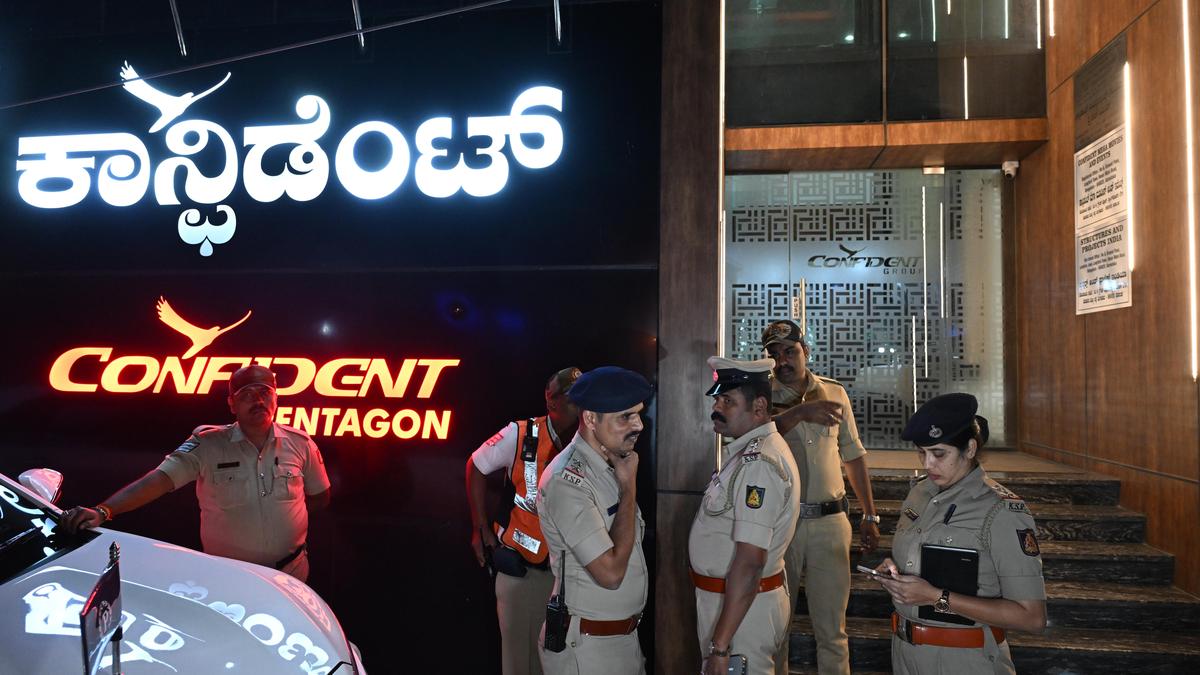 Police officers at the Confident Pentagon building on Langford Road in Bengaluru on Friday.