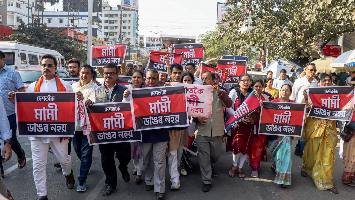Party workers displayed placards and shouted slogans as they passed by properties associated with the Chief Minister’s family. One of the signs read in Assamese: “Deshotkoi mami dangor nohoy”, which means “maternal aunt is not greater than the nation”.