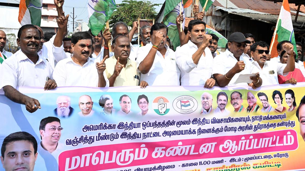 Claiming that the proposed India–U.S. trade deal is detrimental to the welfare of Indian farmers, members of the Erode Urban District Congress Committee staged a demonstration here on Thursday (February 26, 2026), blaming the BJP-led Union government.