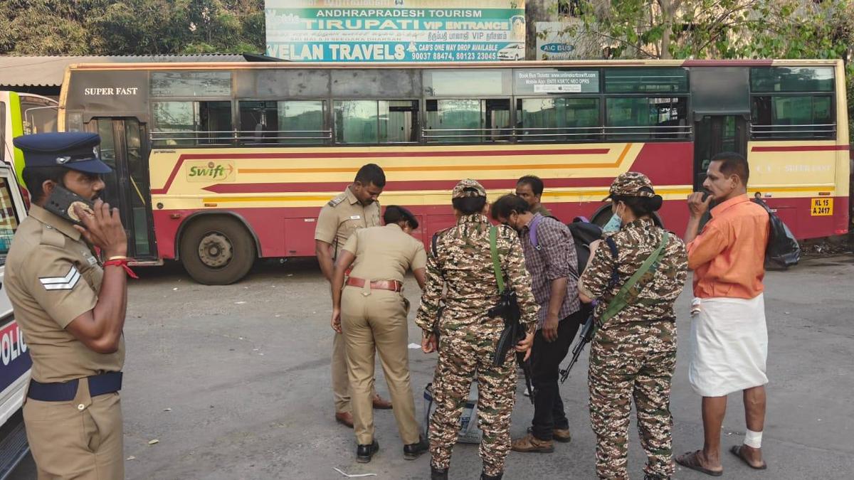 Police and paramilitary personnel conducting a check at Thiruvalluvar bus stand at Gandhipuram in Coimbatore on Sunday.