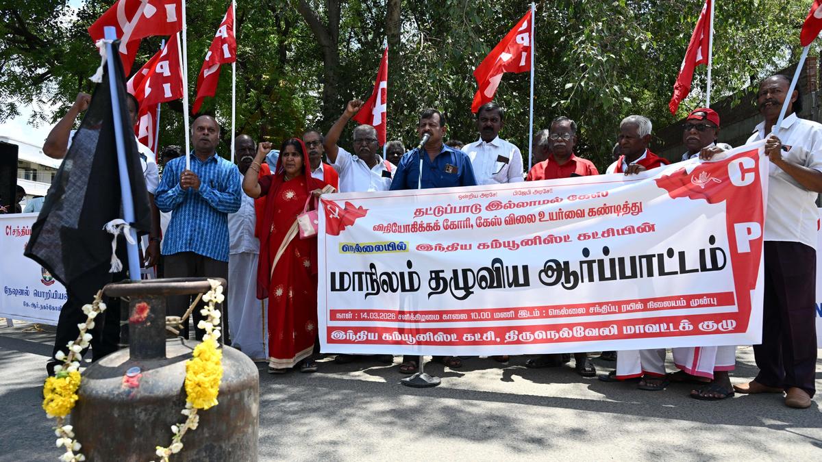 CPI functionaries staging a demonstration in front of Tirunelveli railway junction on Saturday. | Photo Credit: SPECIAL ARRANGEMENT Cadres of Communist Party of India (CPI) staged demonstrations in Tirunelveli on Saturday, opposing the price hike of LPG cylinders and regular supply of domestic and commercial LPG cylinders. The protestors said that due to ongoing conflict in west asian counties, people were already struggling with rising prices and shortages of LPG cylinders. They urged the union government to ensure regular supply of gas cylinders and withdraw the price hike. Published – March 14, 2026 08:41 pm IST Share this: Click to share on WhatsApp (Opens in new window) WhatsApp Click to share on Facebook (Opens in new window) Facebook Click to share on Threads (Opens in new window) Threads Click to share on X (Opens in new window) X Click to share on Telegram (Opens in new window) Telegram Click to share on LinkedIn (Opens in new window) LinkedIn Click to share on Pinterest (Opens in new window) Pinterest Click to email a link to a friend (Opens in new window) Email More Click to print (Opens in new window) Print Click to share on Reddit (Opens in new window) Reddit Click to share on Tumblr (Opens in new window) Tumblr Click to share on Pocket (Opens in new window) Pocket Click to share on Mastodon (Opens in new window) Mastodon Click to share on Nextdoor (Opens in new window) Nextdoor Click to share on Bluesky (Opens in new window) Bluesky Like this:Like Loading... Post navigation Over 2.95 lakh cases settled in National Lok Adalat across Andhra Pradesh No need to panic over LPG supplies, say officials