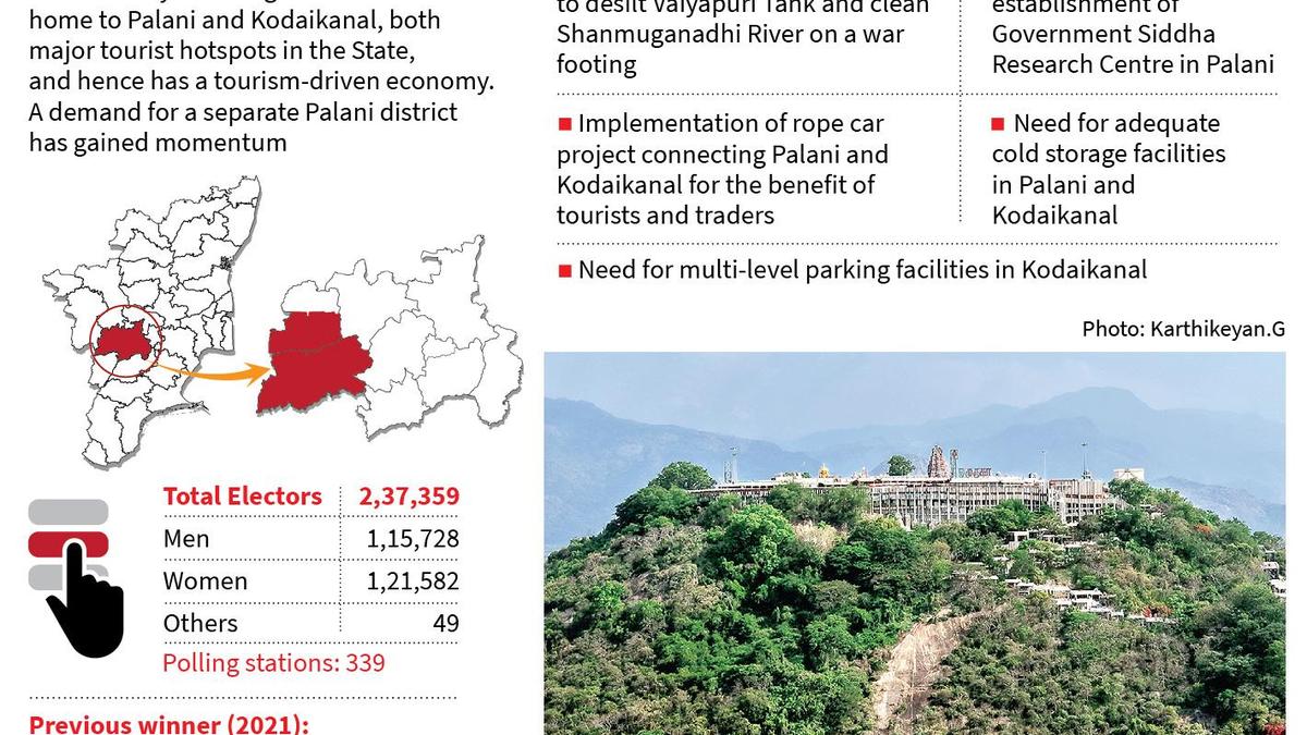 Constituency Watch – Palani The Palani Assembly constituency in Dindigul district is home to both Palani and Kodaikanal, which are among the major tourism hotspots in the State. Palani, the third of the six sacred abodes of Lord Murugan, attracts lakhs of devotees every year, particularly during the Thaipusam festival. Devotees also visit the hill temple in large numbers during the Panguni Uthiram. Published – April 09, 2026 08:38 pm IST Share this: Click to share on WhatsApp (Opens in new window) WhatsApp Click to share on Facebook (Opens in new window) Facebook Click to share on Threads (Opens in new window) Threads Click to share on X (Opens in new window) X Click to share on Telegram (Opens in new window) Telegram Click to share on LinkedIn (Opens in new window) LinkedIn Click to share on Pinterest (Opens in new window) Pinterest Click to email a link to a friend (Opens in new window) Email More Click to print (Opens in new window) Print Click to share on Reddit (Opens in new window) Reddit Click to share on Tumblr (Opens in new window) Tumblr Click to share on Pocket (Opens in new window) Pocket Click to share on Mastodon (Opens in new window) Mastodon Click to share on Nextdoor (Opens in new window) Nextdoor Click to share on Bluesky (Opens in new window) Bluesky Like this:Like Loading... Post navigation Environmental stress from quarrying, waste management issues in focus in Kinathukadavu constituency TVK gained people’s trust in a short period of time: J.C.D. Prabhakar