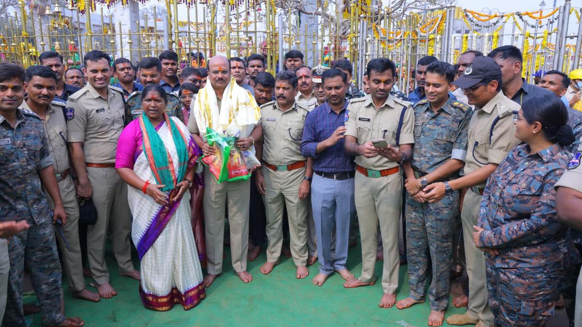 Director General of Police B. Shivadhar Reddy, along with Panchayat Raj and Rural Development Minister Danasari Anasuya Seethakka, at Medaram jatara. | Photo Credit: By Arrangement Director General of Police (DGP) B. Shivadhar Reddy visited Medaram on Friday to review the security arrangements. He first visited the altars of the forest goddesses and offered jaggery, and later inspected the arrangements. Advanced technology has been introduced for the first time at the fair, bringing significant changes in security management, the DGP said. AI-based drone policing system has been put in place where drones, functioning as digital beat officers, are providing real-time inputs from forest areas and the Jampanna stream. He said QR code wristbands introduced to prevent children from getting separated in crowded areas were yielding positive results. Facial recognition software was being used to identify habitual offenders, while AI alerts were helping detect suspicious objects. The DGP also said that more than 13,000 police personnel would be deployed continuously for seven days to maintain law and order, and 37 parking slots in over 2,000 acres had been developed with the ANPR surveillance system. Over 450 CCTV cameras are being monitored from the Command Control Centre in Hyderabad. He added that 3,800 RTC buses were being operating for the convenience of devotees, and police help desks are functioning round the clock. Multi Zone I Inspector General S. Chandrasekhar Reddy, Mulugu Superintendent of Police Kekan Sudhir Ram Nath and other IPS officers, were present during his visit. Published – January 30, 2026 08:34 pm IST Share this: Click to share on WhatsApp (Opens in new window) WhatsApp Click to share on Facebook (Opens in new window) Facebook Click to share on Threads (Opens in new window) Threads Click to share on X (Opens in new window) X Click to share on Telegram (Opens in new window) Telegram Click to share on LinkedIn (Opens in new window) LinkedIn Click to share on Pinterest (Opens in new window) Pinterest Click to email a link to a friend (Opens in new window) Email More Click to print (Opens in new window) Print Click to share on Reddit (Opens in new window) Reddit Click to share on Tumblr (Opens in new window) Tumblr Click to share on Pocket (Opens in new window) Pocket Click to share on Mastodon (Opens in new window) Mastodon Click to share on Nextdoor (Opens in new window) Nextdoor Click to share on Bluesky (Opens in new window) Bluesky Like this:Like Loading... Post navigation Stop propaganda against Sonia, Chennithala tells CPI(M) HRF urges Telangana to implement remission policy for life convicts