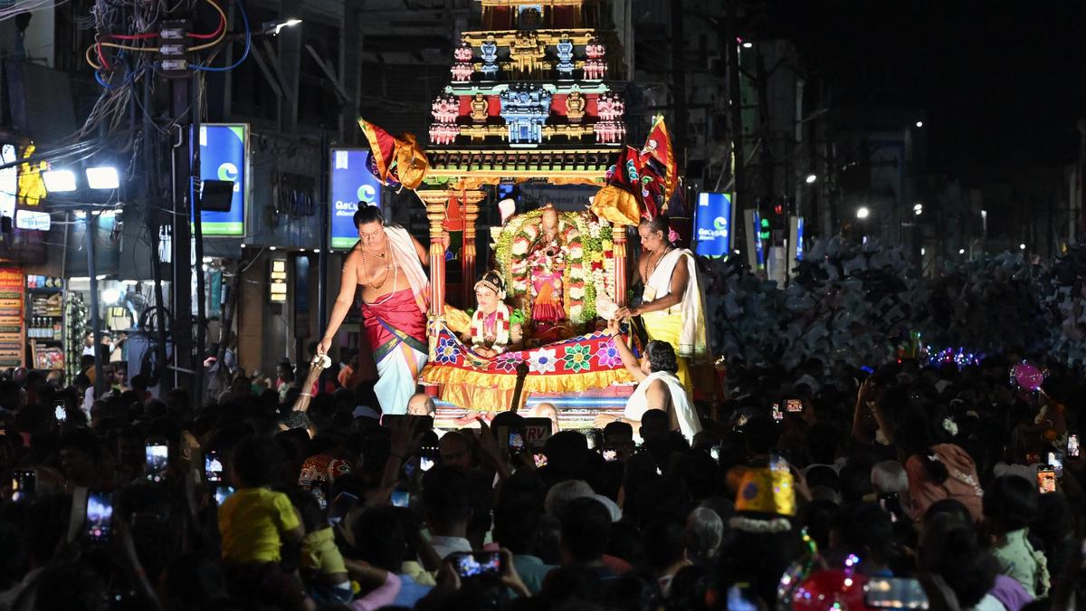 Goddess Meenakshi during the ‘Digvijayam’ procession on East Masi Street in Madurai on Monday, the ninth day of the Chithrai festival. | Photo Credit: R. Ashok The ‘Digvijayam’ procession was taken out in Madurai on the ninth day of the annual Chithirai festival on Monday. Goddess Meenakshi’s battles in eight directions were enacted by children. The event takes place after Pattabhishekam or coronation of Goddess Meenakshi and before Thirukalyanam or the celestial wedding of the Goddess with Lord Sundareswarar. Published – April 27, 2026 11:46 pm IST Share this: Click to share on WhatsApp (Opens in new window) WhatsApp Click to share on Facebook (Opens in new window) Facebook Click to share on Threads (Opens in new window) Threads Click to share on X (Opens in new window) X Click to share on Telegram (Opens in new window) Telegram Click to share on LinkedIn (Opens in new window) LinkedIn Click to share on Pinterest (Opens in new window) Pinterest Click to email a link to a friend (Opens in new window) Email More Click to print (Opens in new window) Print Click to share on Reddit (Opens in new window) Reddit Click to share on Tumblr (Opens in new window) Tumblr Click to share on Pocket (Opens in new window) Pocket Click to share on Mastodon (Opens in new window) Mastodon Click to share on Nextdoor (Opens in new window) Nextdoor Click to share on Bluesky (Opens in new window) Bluesky Like this:Like Loading... Post navigation Body found near railway tracks in Kannur Amid fresh unrest, Home Secretary reviews Manipur security situation