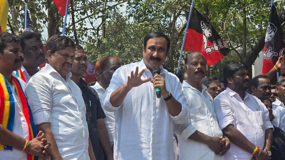 PMK president Anbumani Ramadoss speaking at a protest organised by the National Democratic Alliance (NDA) in Cuddalore on March 17, 2026
