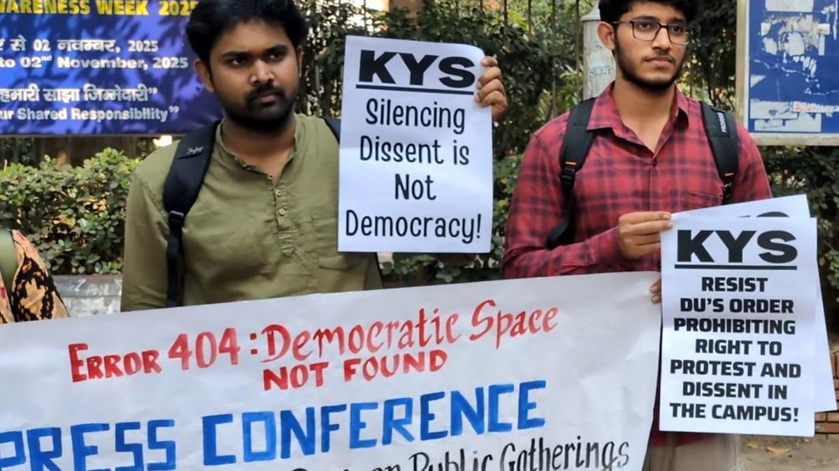 The student leaders termed the prohibition a ‘direct attack on education’. Photo Special Arrangement Three student outfits on Thursday (February 19, 2026) held a press conference demanding the revocation of the month-long prohibition on demonstrations imposed by Delhi University earlier this week. On Tuesday (February 17, 2026), DU Proctor Manoj Kumar Singh issued an order imposing a ban on protests, public meetings, processions, and demonstrations on the university campuses. The order came four days after clashes were reported at an event held by the All India Students’ Association (AISA) in support of the University Grants Commission’s (UGC) equity rules. ‘Undemocratic order’ Earlier in the day, members from the three Left-aligned organisations — All India Democratic Students’ Organisation (AIDSO), Krantikari Yuva Sangathan (KYS) and All India Students’ Federation (AISF) — gathered at the Arts Faculty gate, where the clashes were reported on February 13, denouncing the “undemocratic” ban. The students said DU’s security personnel stopped them and tore up their posters. Following this, the students briefed the media around 100 metres from the Arts Faculty building. “We consider the order not only undemocratic but also a direct attack on the very essence of education. It aims to smother all forms of debate, discussion and healthy dialogue in the campus,” said AIDSO’s DU in-charge Adrika. If the order is not revoked, she added that “students shall expedite the movement to reclaim their rightful democratic campus space”. The student leaders said the reason cited by the Proctor for the ban — “maintaining peace and tranquillity on campus” — was vague. A day earlier, the DU Teachers’ Association appealed to the administration to revisit its order, stating that such a ban had never been imposed in the university’s history. It appealed for social and cultural events to be exempted from the order. Published – February 20, 2026 06:15 am IST Share this: Click to share on WhatsApp (Opens in new window) WhatsApp Click to share on Facebook (Opens in new window) Facebook Click to share on Threads (Opens in new window) Threads Click to share on X (Opens in new window) X Click to share on Telegram (Opens in new window) Telegram Click to share on LinkedIn (Opens in new window) LinkedIn Click to share on Pinterest (Opens in new window) Pinterest Click to email a link to a friend (Opens in new window) Email More Click to print (Opens in new window) Print Click to share on Reddit (Opens in new window) Reddit Click to share on Tumblr (Opens in new window) Tumblr Click to share on Pocket (Opens in new window) Pocket Click to share on Mastodon (Opens in new window) Mastodon Click to share on Nextdoor (Opens in new window) Nextdoor Click to share on Bluesky (Opens in new window) Bluesky Like this:Like Loading... Post navigation Jammu and Kashmir’s Kishtwar admn. calls for regulation of Ramzan charity, evokes criticism from NC, PDP White-throated sparrows show sex in nature is not a simple binary