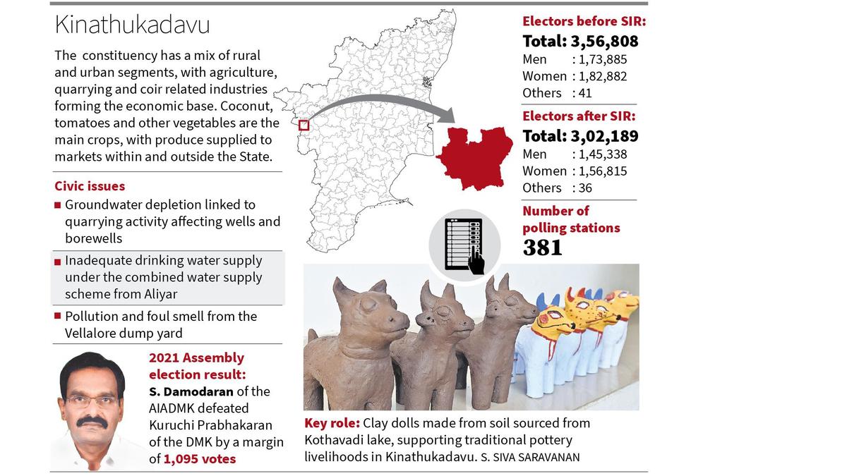 Groundwater depletion linked to stone quarrying, irregular drinking water supply and pollution from the Vellalore dump yard remain key concerns in the Kinathukadavu Assembly constituency as it heads into the election. The Kinathukadavu Assembly constituency bordering Kerala, comprises Madukkarai Municipality, six town panchayats – Kinathukadavu, Vellalore, Ettimadai, Thirumalaiyampalayam, Othakkalmandapam and Chettipalayam – and seven village panchayats – Sokkanur, Pottaiyandipurambu, Vadaputhur, Solavampalayam, Kuthiraialayampalayam, N.10 Muthur and Kodangipalayam. Parts of the Coimbatore South region and wards 94 to 100 of the Coimbatore Corporation, including Kurichi and the SIDCO industrial estate, also fall within the segment. Published – April 09, 2026 11:25 pm IST Share this: Click to share on WhatsApp (Opens in new window) WhatsApp Click to share on Facebook (Opens in new window) Facebook Click to share on Threads (Opens in new window) Threads Click to share on X (Opens in new window) X Click to share on Telegram (Opens in new window) Telegram Click to share on LinkedIn (Opens in new window) LinkedIn Click to share on Pinterest (Opens in new window) Pinterest Click to email a link to a friend (Opens in new window) Email More Click to print (Opens in new window) Print Click to share on Reddit (Opens in new window) Reddit Click to share on Tumblr (Opens in new window) Tumblr Click to share on Pocket (Opens in new window) Pocket Click to share on Mastodon (Opens in new window) Mastodon Click to share on Nextdoor (Opens in new window) Nextdoor Click to share on Bluesky (Opens in new window) Bluesky Like this:Like Loading... Post navigation Drinking water scarcity, accidents on highway are the burning problems of Kulithalai constituency Demand for a separate Palani district gains momentum