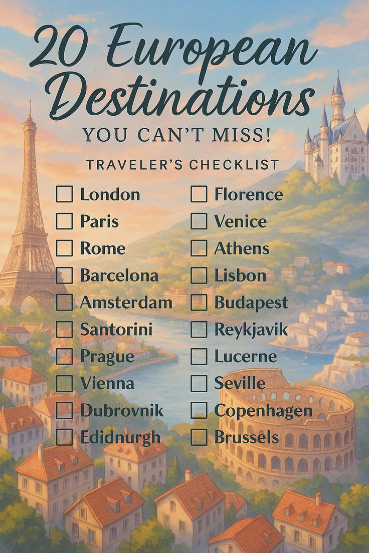 Get ready for your dream summer getaway with this guide to the best European countries for your Europe Summer Travel 2025! From the sun-kissed beaches of Southern Europe to the cultural treasures of Paris, Rome, and beyond, discover the top Europe travel destinations. Whether you’re interested in exploring historic landmarks, taking a scenic Europe road trip, or soaking up the sun in charming coastal towns, this guide has it all. Find the perfect Europe itinerary and start planning your next European adventure today! 🌍✨ #EuropeanTourItinerary #Travel2025 #EuropeSummerTravel #TravelEuropeDestinations #EuropeItinerary #EuropeRoadTrip #VacationEurope Share this: Click to share on WhatsApp (Opens in new window) WhatsApp Click to share on Facebook (Opens in new window) Facebook Click to share on Threads (Opens in new window) Threads Click to share on X (Opens in new window) X Click to share on Telegram (Opens in new window) Telegram Click to share on LinkedIn (Opens in new window) LinkedIn Click to share on Pinterest (Opens in new window) Pinterest Click to email a link to a friend (Opens in new window) Email More Click to print (Opens in new window) Print Click to share on Reddit (Opens in new window) Reddit Click to share on Tumblr (Opens in new window) Tumblr Click to share on Pocket (Opens in new window) Pocket Click to share on Mastodon (Opens in new window) Mastodon Click to share on Nextdoor (Opens in new window) Nextdoor Click to share on Bluesky (Opens in new window) Bluesky Like this:Like Loading... Post navigation Pin by Suzanne Martin Gadrim on Travel in 2025 | See the northern lights, Cool places to visit, Top family vacations Bolsa de Viagem Multifuncional e Fofa para Mulheres, Bolsa de Viagem de Grande Capacidade para Viagem Curta, Bolsa… in 2025 duffel, Duffel bag travel, Luggage bags