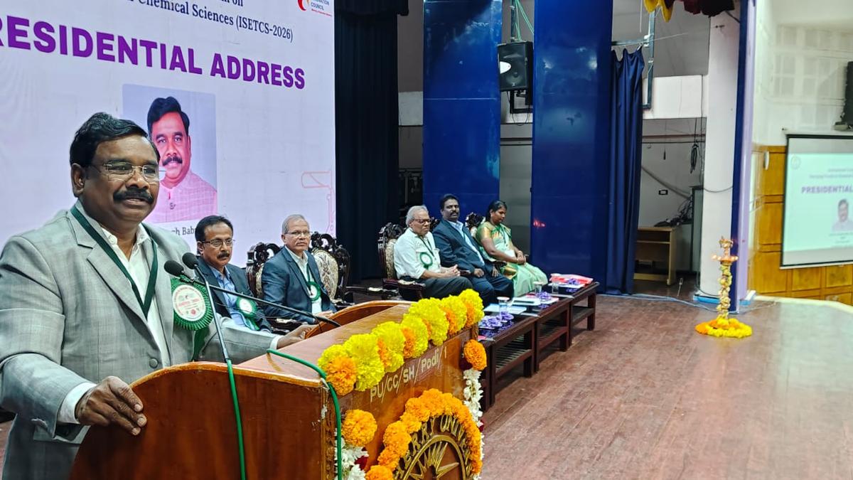 Pondicherry University Vice-Chancellor P. Prakash Babu addressing a symposium on chemical sciences hosted by the Department of Chemistry recently. | Photo Credit: Special Arrangement Experts participating in a symposium reiterated the importance of chemistry in sustainability, advanced materials, and energy-related research. Addressing the recent international symposium on ‘Emerging Trends in Chemical Sciences (ISETCS–2026)’, P. Prakash Babu, Vice-Chancellor, who delivered the presidential address, outlined the growing global need for interdisciplinary research and emphasised the pivotal role of chemists in addressing contemporary scientific, technological, and societal challenges. The event, hosted by the Department of Chemistry, Pondicherry University, brought together academicians, researchers, and students from India and abroad to deliberate on recent advances and emerging directions in the chemical sciences. K. Tharanikkarasu, Director of Studies, and Sibnath Deb, Dean of School of Physical, Chemical and Applied Sciences, highlighted the importance of chemistry in sustainability, advanced materials, and energy-related research. D. Basavaiah, leading chemist and INSA Senior Scientist at University of Hyderabad, in his keynote address, outlined current expectations of chemists across disciplines. M. Bakthadoss, Chairman of ISETCS–2026 and Head of the Department of Chemistry, Pondicherry University, also spoke. On the occasion, the Vice-Chancellor and other dignitaries released the Book of Abstracts. The technical sessions featured plenary lectures by eminent scientists, such as Garry Hanan (Université de Montréal, Canada), I. I. N. Namboothiri (IIT Bombay), Mihaela Cibian (Université du Québec, Canada), and Kiran K. Pulukuri (IISER Tirupati). The lectures shared insights on contemporary research areas, such as Baylis – Hillman chemistry, natural product chemistry, advanced catalytic methodologies, coordination and organometallic chemistry, and innovative strategies for the synthesis of complex molecules, a press note said. A poster presentation segment served as an engaging forum for young researchers and students to showcase their research outcomes and interact with experts in the field. Published – February 17, 2026 09:46 pm IST Share this: Click to share on WhatsApp (Opens in new window) WhatsApp Click to share on Facebook (Opens in new window) Facebook Click to share on Threads (Opens in new window) Threads Click to share on X (Opens in new window) X Click to share on Telegram (Opens in new window) Telegram Click to share on LinkedIn (Opens in new window) LinkedIn Click to share on Pinterest (Opens in new window) Pinterest Click to email a link to a friend (Opens in new window) Email More Click to print (Opens in new window) Print Click to share on Reddit (Opens in new window) Reddit Click to share on Tumblr (Opens in new window) Tumblr Click to share on Pocket (Opens in new window) Pocket Click to share on Mastodon (Opens in new window) Mastodon Click to share on Nextdoor (Opens in new window) Nextdoor Click to share on Bluesky (Opens in new window) Bluesky Like this:Like Loading... Post navigation Human super-predators not always ‘super-scary’ to wildlife, finds study Indian Army puts up a show with homegrown dual-use AI systems