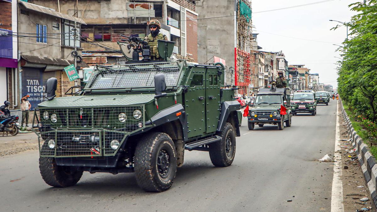 Security forces patrol during curfew hours following the killing of two toddlers from Tronglaobi in Bishnupur district in a suspected rocket launcher attack, in Imphal West on Thursday, April 9, 2026.