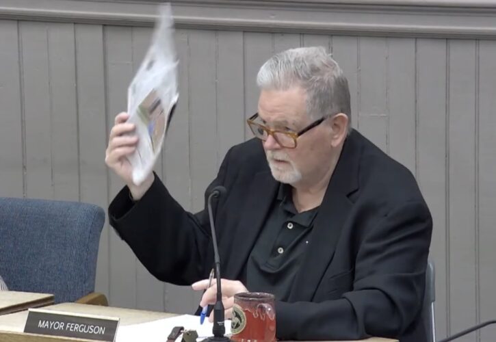 Fredonia Mayor Michael Ferguson waves a copy of an OBSERVER article that summarized SUNY Fredonia student newspaper pieces critical of the village government over Fred Fest and the water situation.
