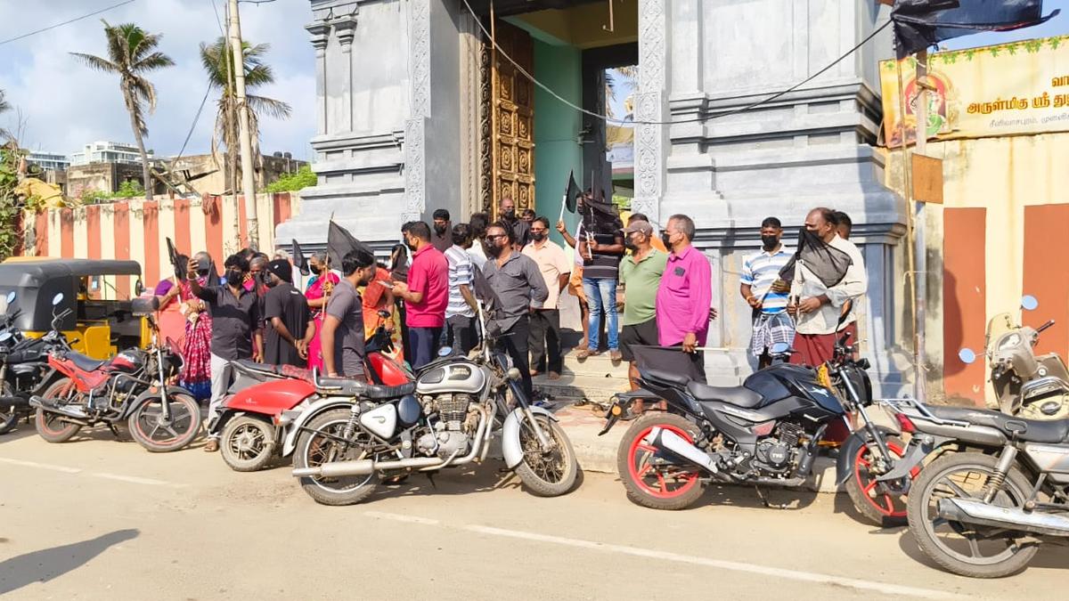 Residents of Srinivasapuram protesting at the Amma temple at the entrance to the hamlet on Wednesday. | Photo Credit: SPECIAL ARRANGEMENT Residents of Srinivasapuram (Mullikuppam and Mullima Nagar), a fishing hamlet near Foreshore Estate, staged a protest against DMK candidate for Mylapore, Dha Velu, on Wednesday when he went to canvass for votes. Waving black flags and wearing black masks, they stood at the Amma temple at the entrance to the fishing hamlet. “We want the government to return to us the lands belonging to our village, where the housing board had constructed houses for government employees. The village owns those lands. We also want houses for those who don’t have houses. The DMK, in its manifesto for the 2021 elections, had promised to construct houses for us. That remains on print,” said Sekar of Srinivasapuram. Published – April 16, 2026 12:33 am IST Share this: Click to share on WhatsApp (Opens in new window) WhatsApp Click to share on Facebook (Opens in new window) Facebook Click to share on Threads (Opens in new window) Threads Click to share on X (Opens in new window) X Click to share on Telegram (Opens in new window) Telegram Click to share on LinkedIn (Opens in new window) LinkedIn Click to share on Pinterest (Opens in new window) Pinterest Click to email a link to a friend (Opens in new window) Email More Click to print (Opens in new window) Print Click to share on Reddit (Opens in new window) Reddit Click to share on Tumblr (Opens in new window) Tumblr Click to share on Pocket (Opens in new window) Pocket Click to share on Mastodon (Opens in new window) Mastodon Click to share on Nextdoor (Opens in new window) Nextdoor Click to share on Bluesky (Opens in new window) Bluesky Like this:Like Loading... Post navigation American Center Chennai to host free summer activities for students Three youths killed in road accident in Kalaburagi