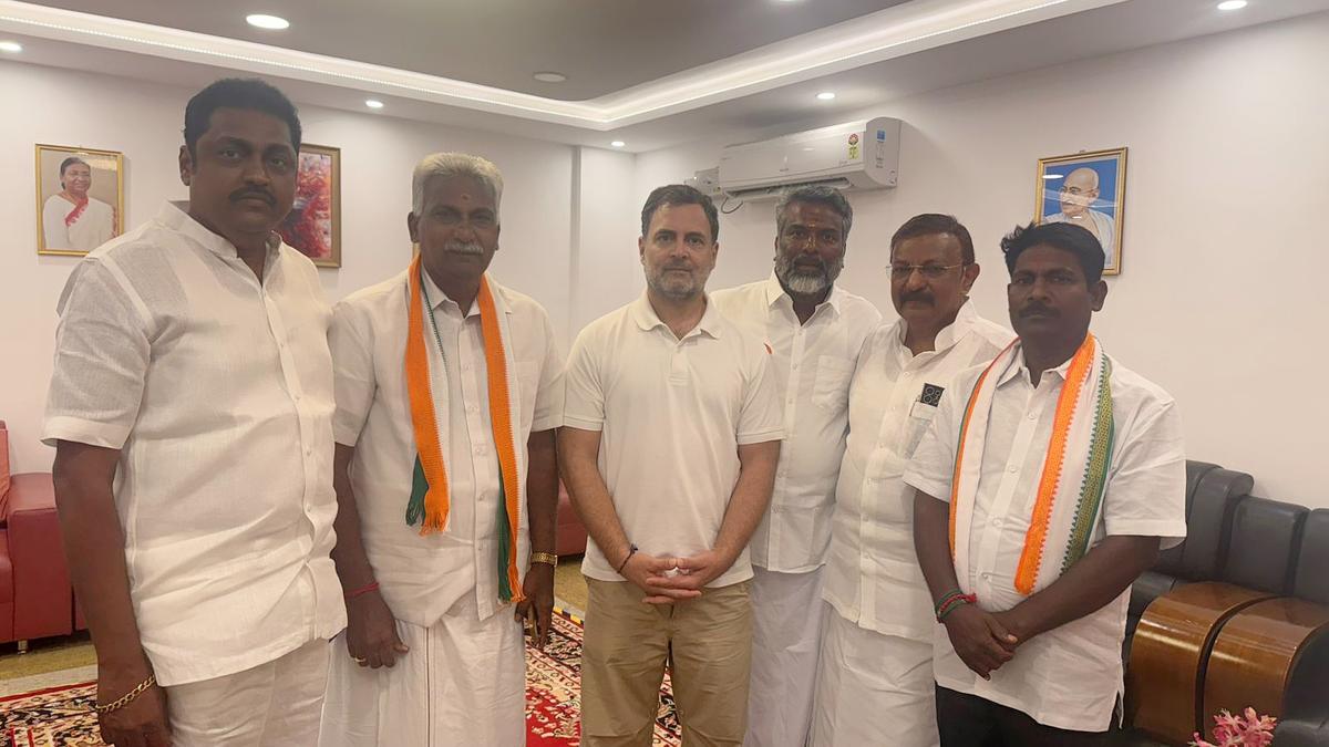 The five Congress ‘rebel’ candidates met Leader of Opposition Rahul Gandhi at Puducherry airport and sought his support. | Photo Credit: SPECIAL ARRANGEMENT While the Puducherry Pradesh Congress Committee was arguing against the six party candidates who are in fray in constituencies allocated to the DMK and the VCK in the INDIA bloc, party senior leader Rahul Gandhi on Monday gave the ‘rebel’ candidates audience and posed for photographs with them at the airport when he was leaving after addressing a public meeting as part of the Congress campaign for the April 9 polls in the Union Territory. During the Congress-DMK standoff over sharing of seats for the elections, several Congress members had jumped into the poll fray by filing papers on the last day of submission of nominations on March 23. As many as 23 Congress members after collecting party authorisation forms from the PPCC leadership had filed nomination papers in their preferred constituencies. Published – April 06, 2026 09:02 pm IST Share this: Click to share on WhatsApp (Opens in new window) WhatsApp Click to share on Facebook (Opens in new window) Facebook Click to share on Threads (Opens in new window) Threads Click to share on X (Opens in new window) X Click to share on Telegram (Opens in new window) Telegram Click to share on LinkedIn (Opens in new window) LinkedIn Click to share on Pinterest (Opens in new window) Pinterest Click to email a link to a friend (Opens in new window) Email More Click to print (Opens in new window) Print Click to share on Reddit (Opens in new window) Reddit Click to share on Tumblr (Opens in new window) Tumblr Click to share on Pocket (Opens in new window) Pocket Click to share on Mastodon (Opens in new window) Mastodon Click to share on Nextdoor (Opens in new window) Nextdoor Click to share on Bluesky (Opens in new window) Bluesky Like this:Like Loading... Post navigation Kerala Assembly Polls 2026: BJP circulating ‘malicious’ AI-generated video to target candidate: Congress Secunderabad Cantonment Board to collect property transfer tax directly from June 1, rate unchanged at 5%